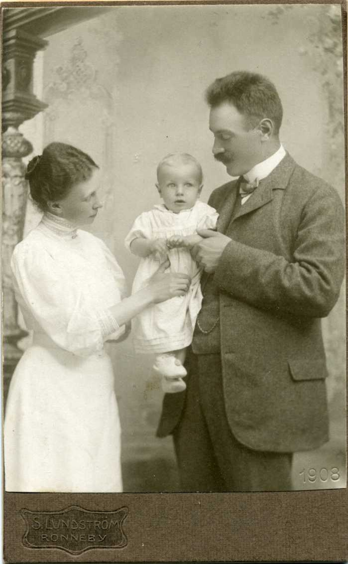 Porträtt av en kvinna och man, mannen håller deras barn i famnen