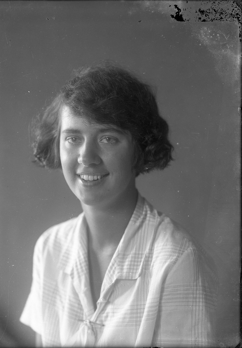 Porträtt av en okänd ung skrattande kvinna i rutig blus, bröstbild.