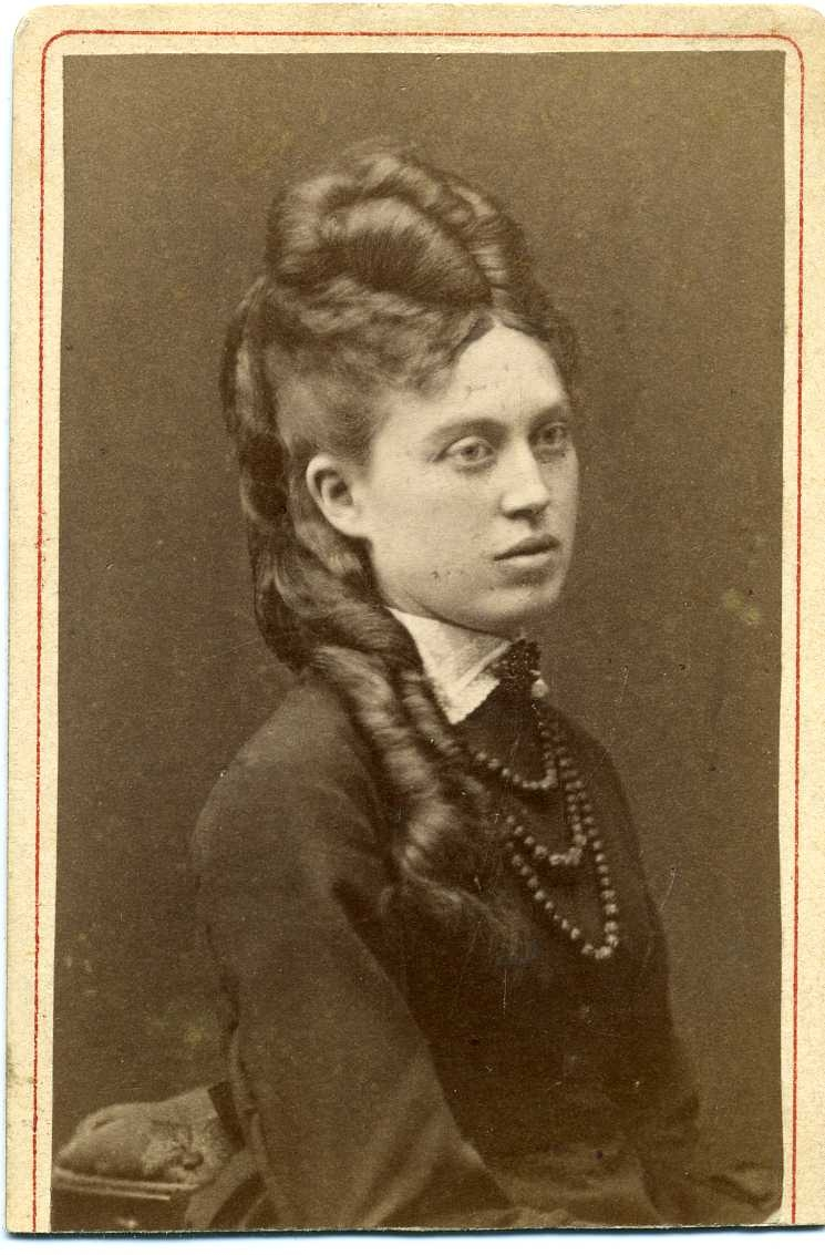 Porträtt av en kvinna i mörkt med uppsatt hår.