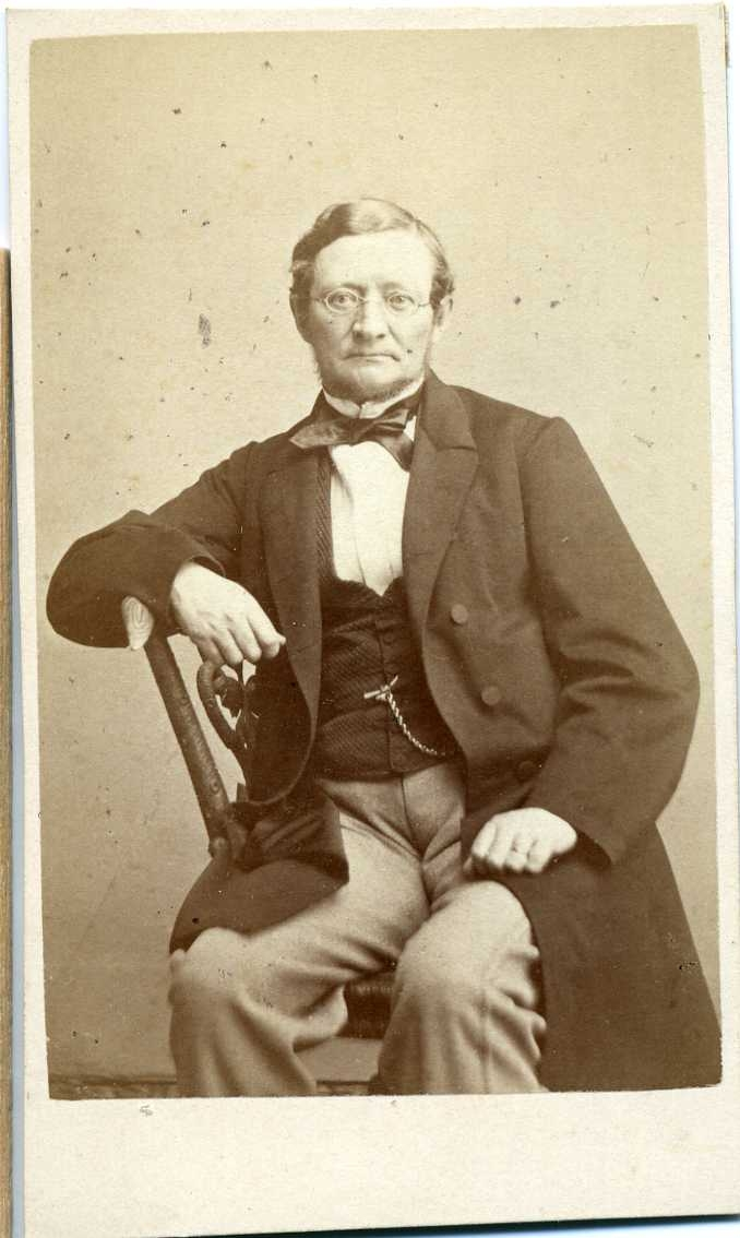Porträtt av en man med glasögon. Han sitter på snedden på en stol och vilar höger arm på stolsryggen.