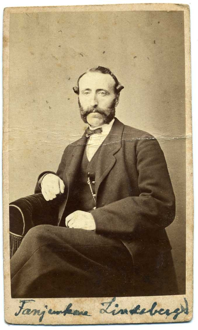 Porträtt av en man med mustasch, polisonger och lockar vid öronen.