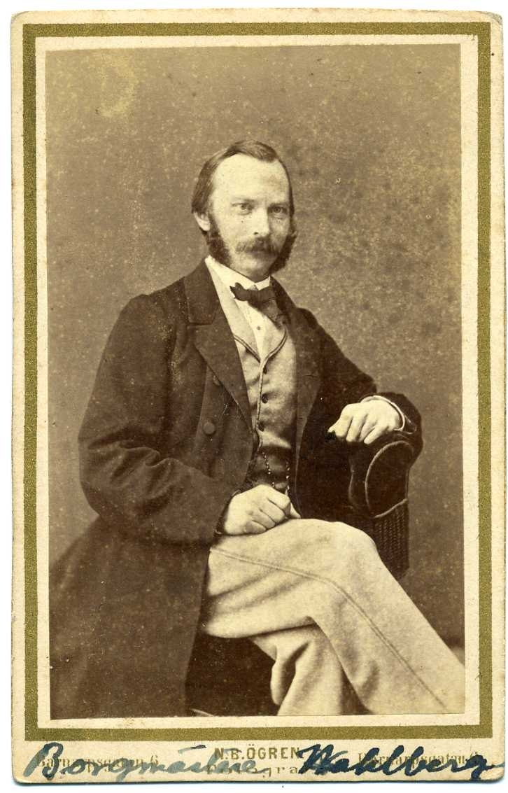 Porträtt av en man med mustasch och polisonger, han sitter på en emma.