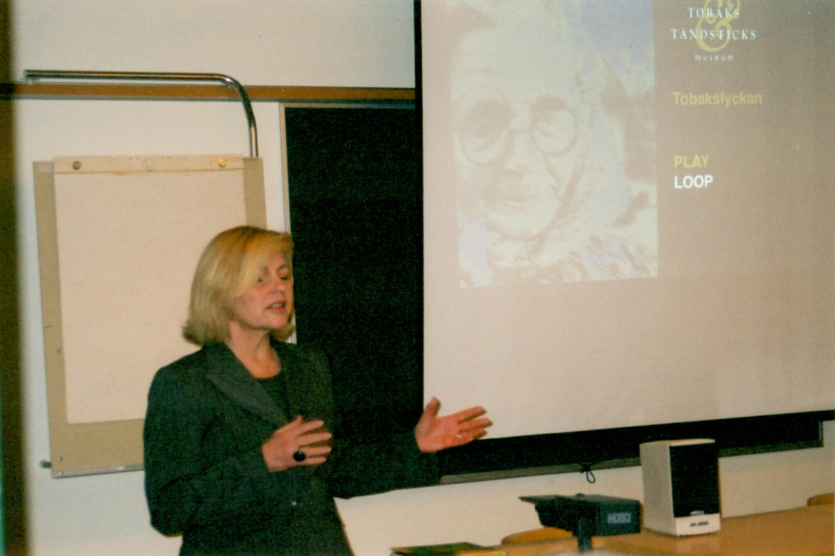 Inga Junhem, f.d. museichef på Snus- och Tändsticksmuseet, håller i ett föredrag i samband med utställningen "Prisad planta" på Kalmar läns museum 2004.