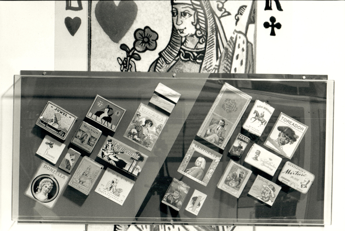 Monter med diverse tobaksförpackningar i Tobaksmuseet 1994-1995