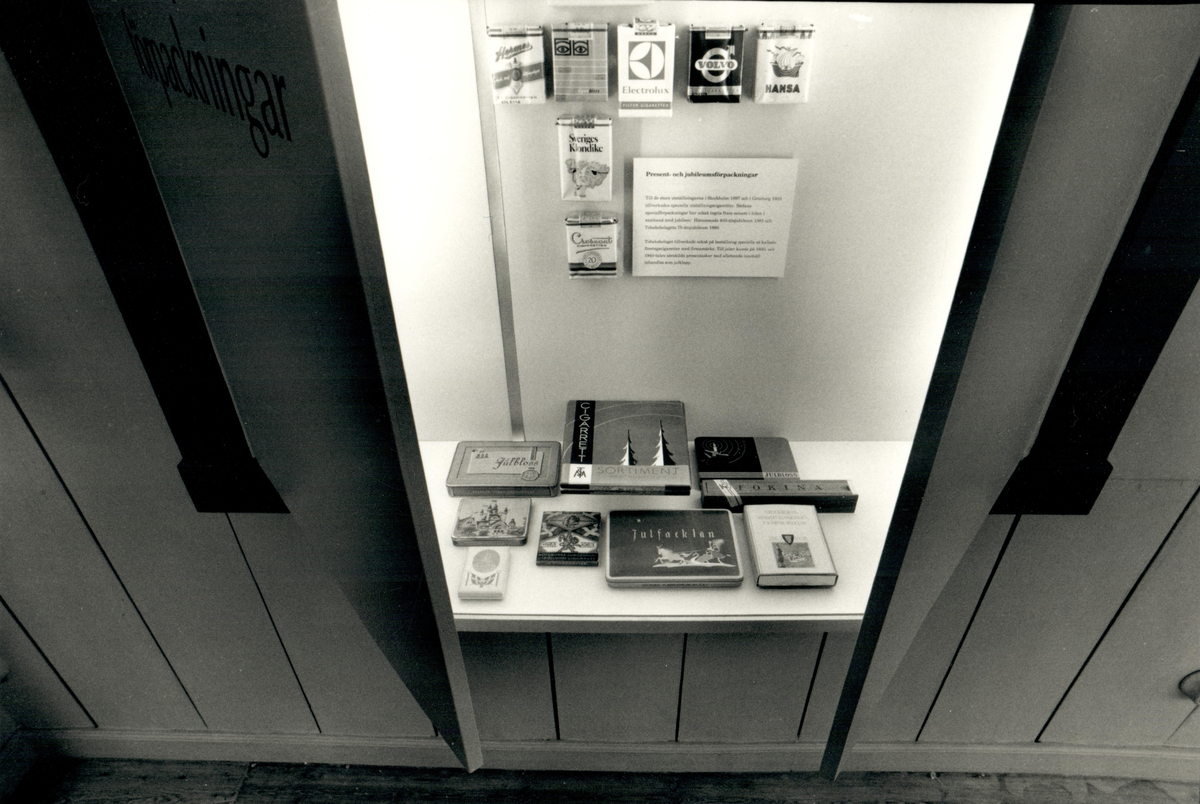 Present- och jubileumsförpackningar i en monter på Tobaksmuseet, 90-tal.