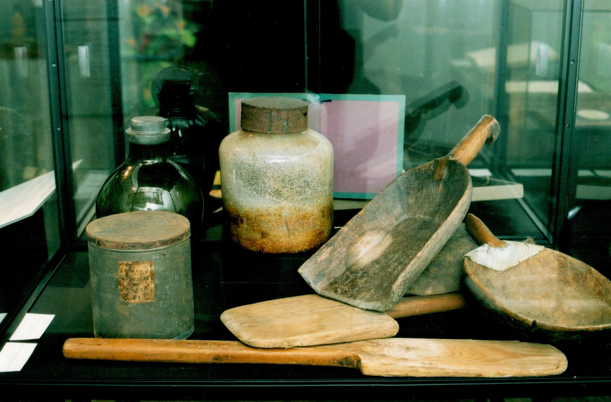 Föremål i en monter på utställningen "Prisad planta" på Kalmar läns museum 2004.