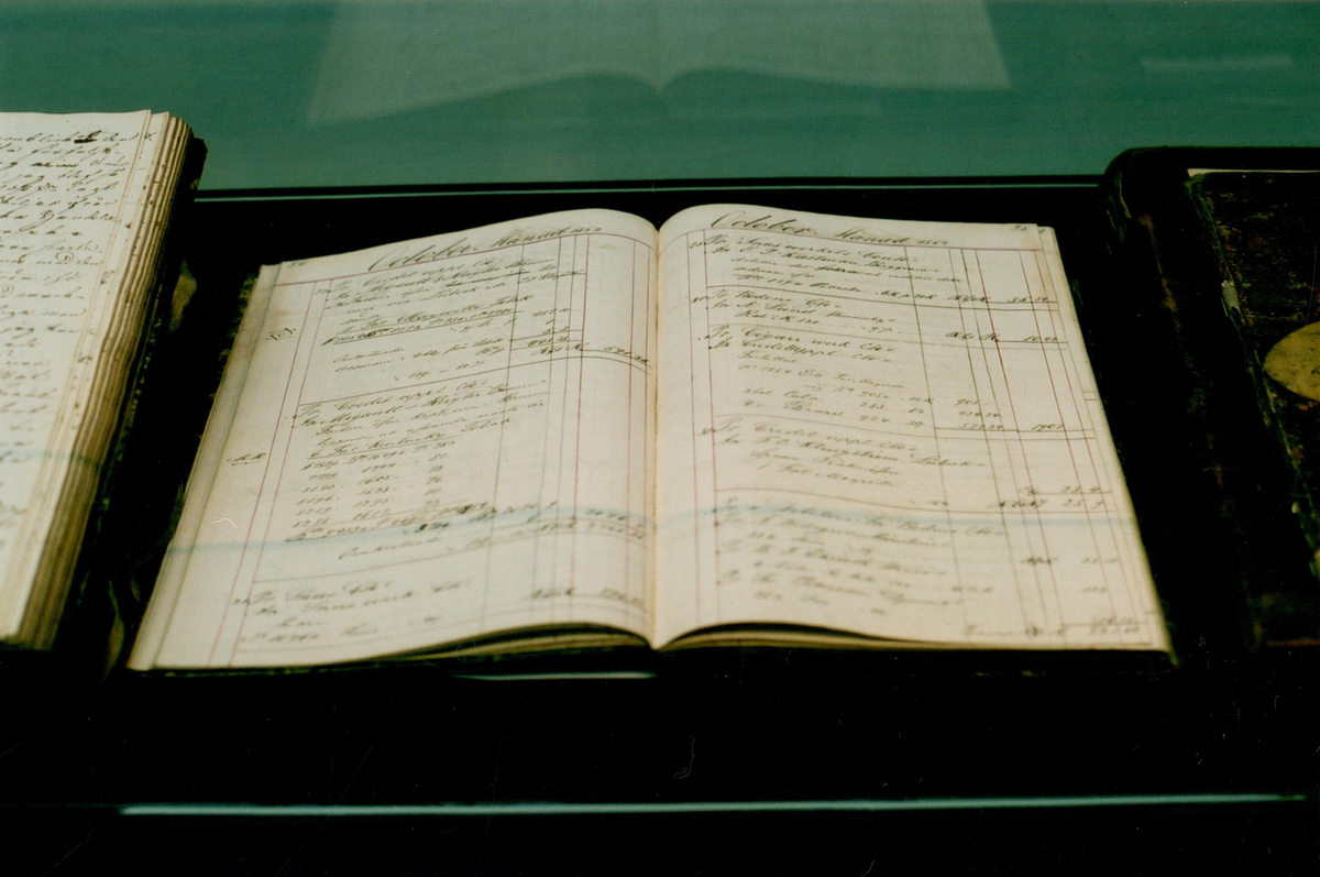 Räkenskapsbok vid utställningen "Prisad planta" på Kalmar läns museum 2004.