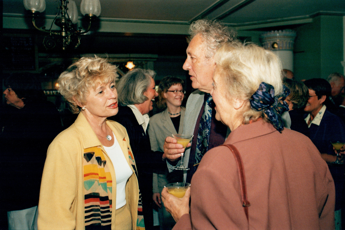 Inga Junhem pratar med museibesökare vid invigningen av cigarrutställningen i Tobaksmuseet, 90-tal.