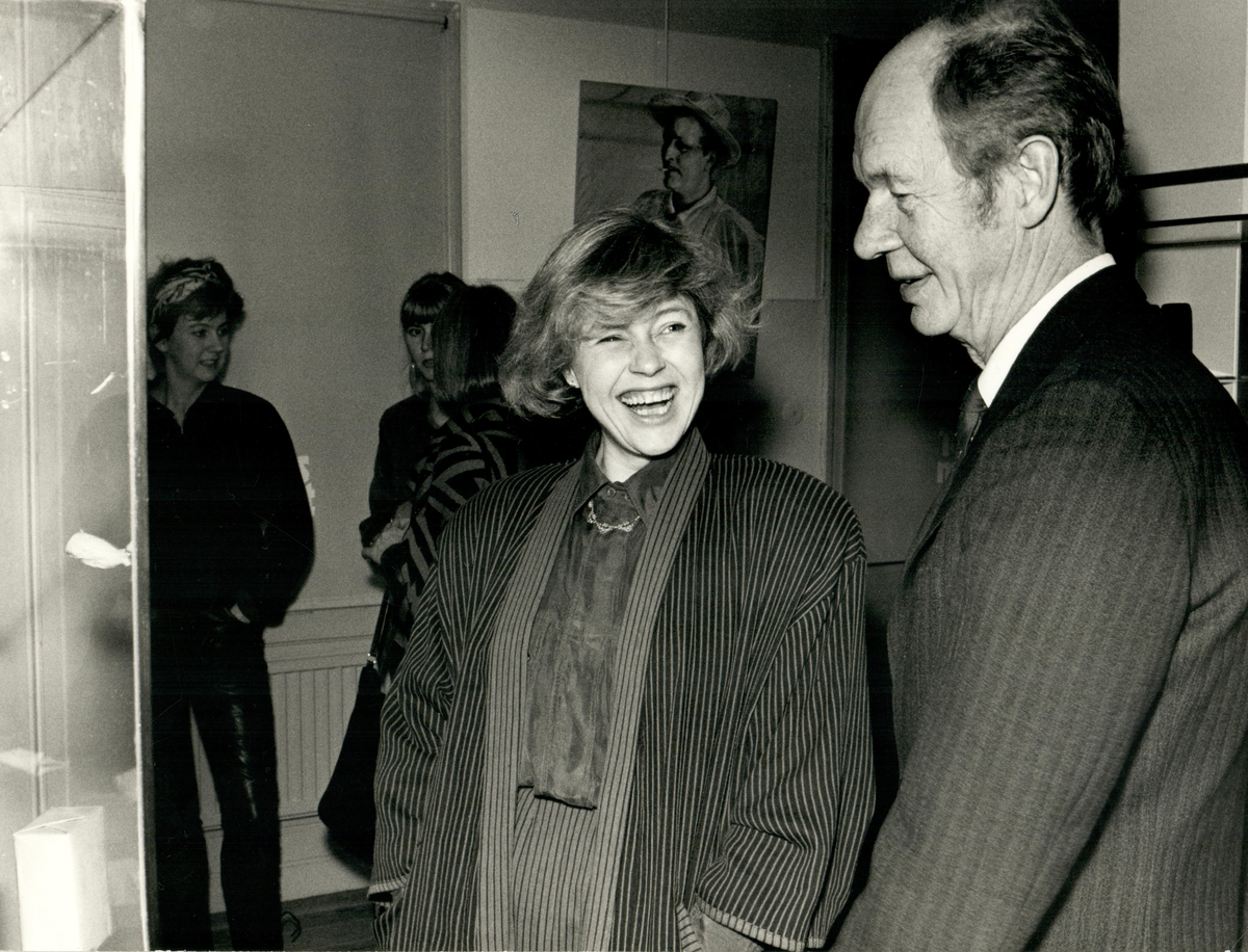 Inga Junhem i konversation med en museibesökare på Tobaksmuseet.