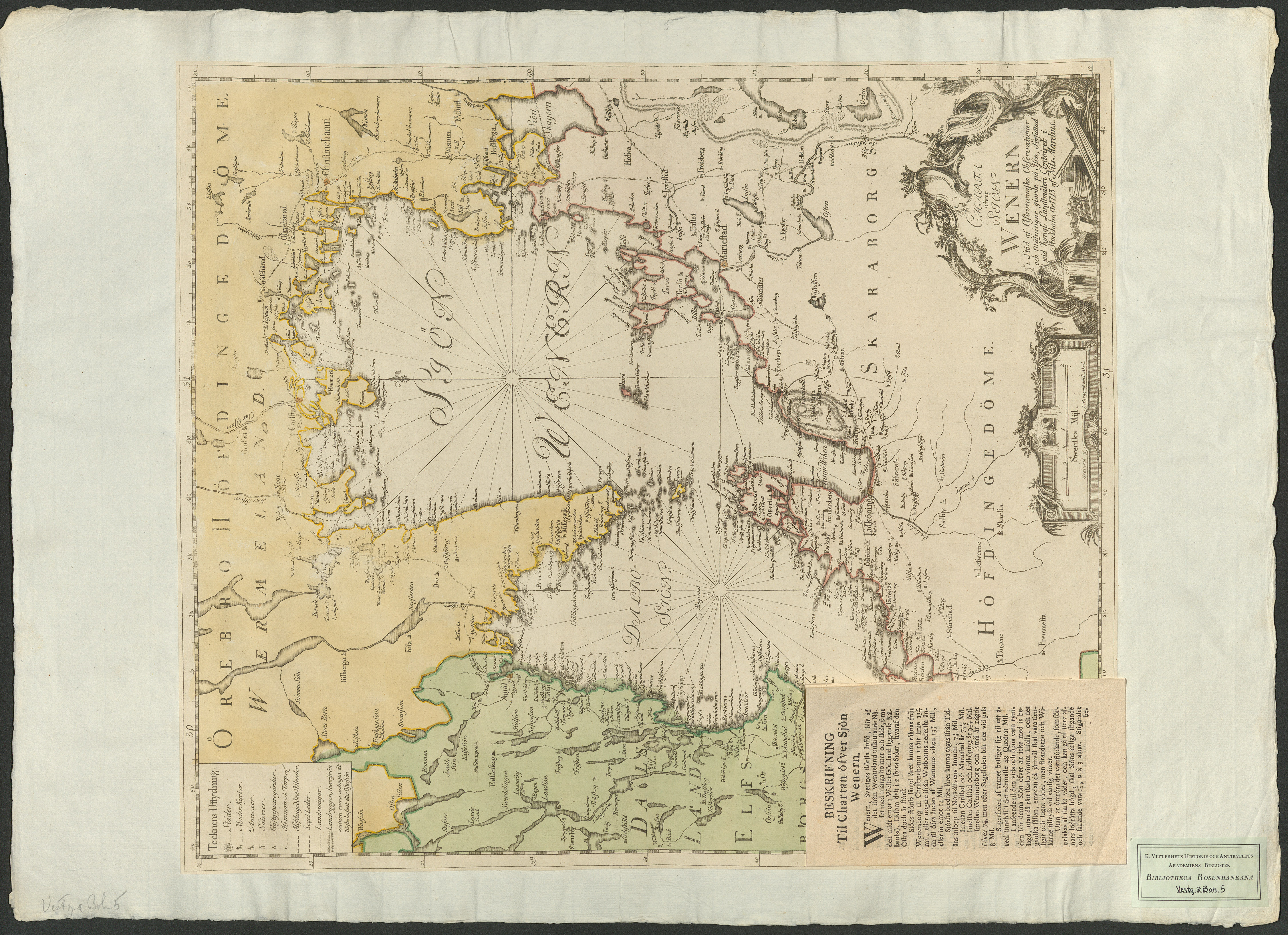 Beskrivning: 1 karta : Topografisk karta med vidhängande häfte om fyra blad. Häftets titel: Beskrifning til chartan öfver sjön Wenern. författad wid Kongl. Landtmäteri contoiret i Stockholm år 1773 af Nils Marelius ; graverad af C. Bergqvist och F. Akrel.