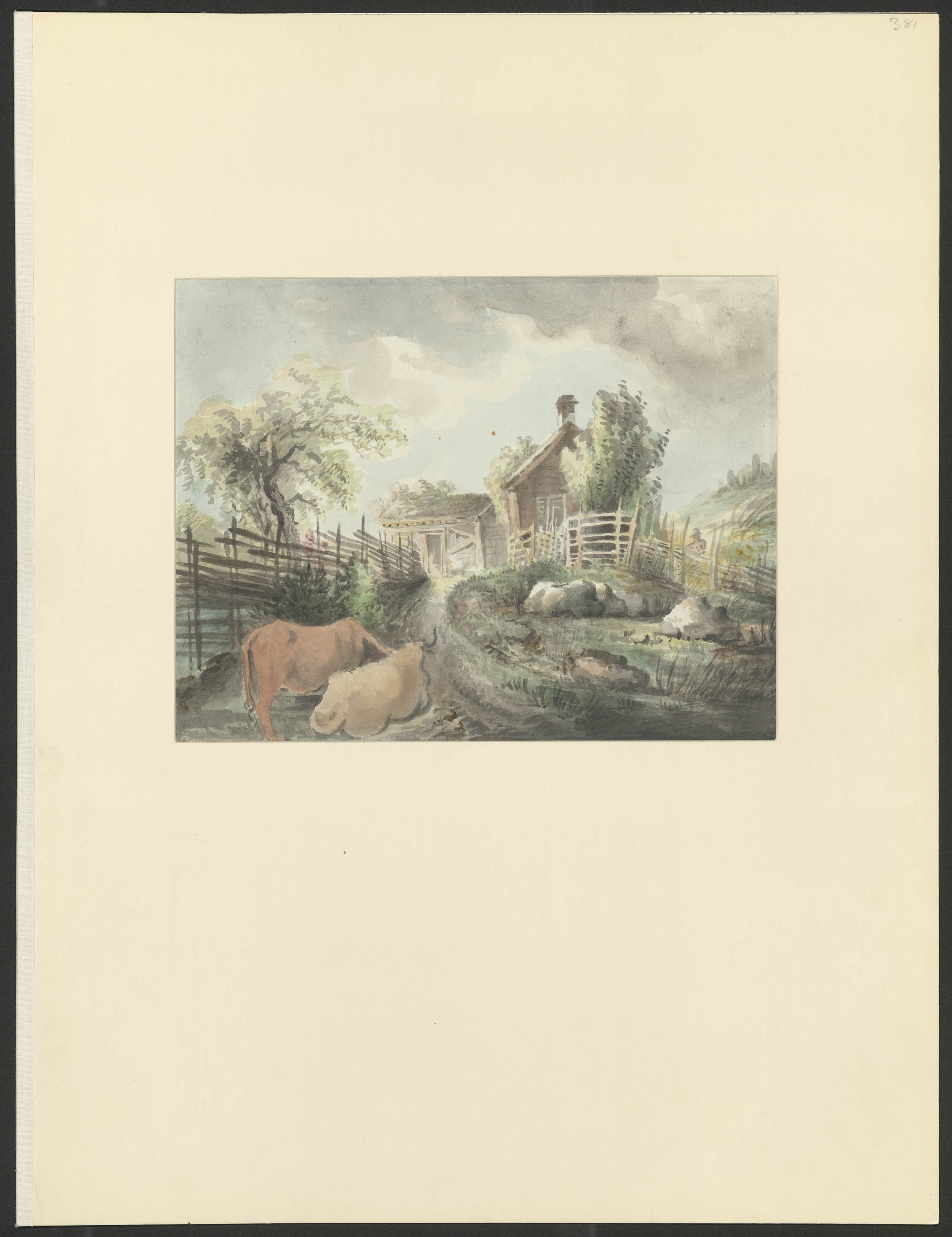 Beskrivning: 1 bl. : Torp med uthus på en höjd. I förgrunden två kor.