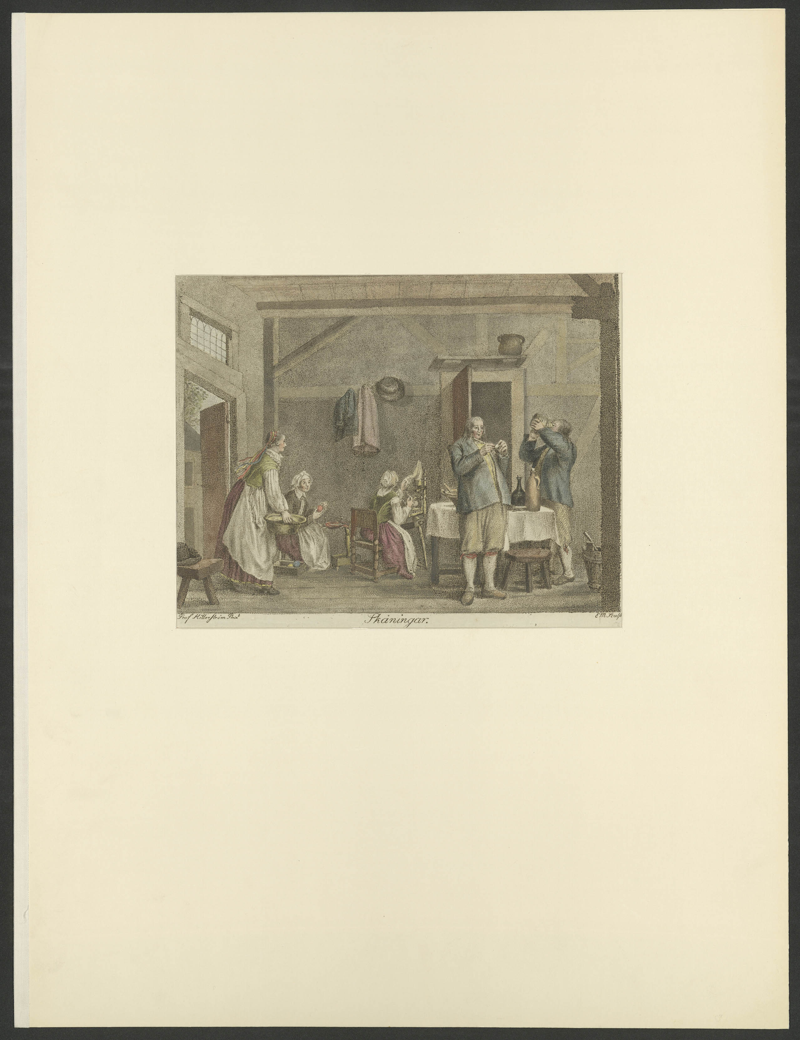 Beskrivning: 1 grafiskt bl. : Interiör. Två män står vid ett bord, dricker och stoppar kritpipa. En kvinna spinner. En kvinna nystar garn. En kvinna bär in ett fat. Prof. Hillerström Pinx:t ; E. M. Sculpt.