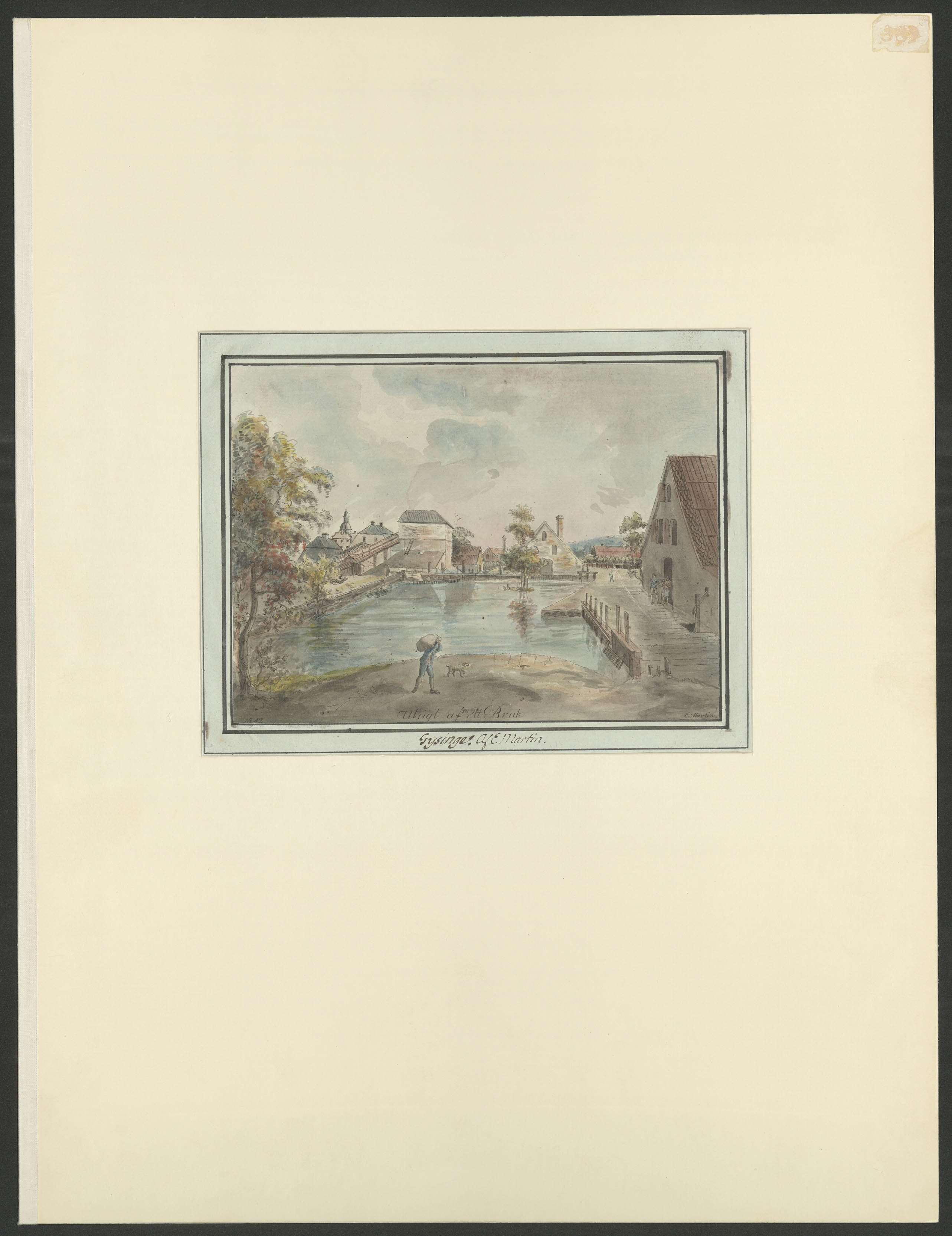 Beskrivning: 1 grafiskt bl. : 1 bl. : I förgrunden en man med en säck på ryggen. Bakom honom bruksdammen och byggnaderna. Bruksdammen med omgivande byggnader. E. Martin
