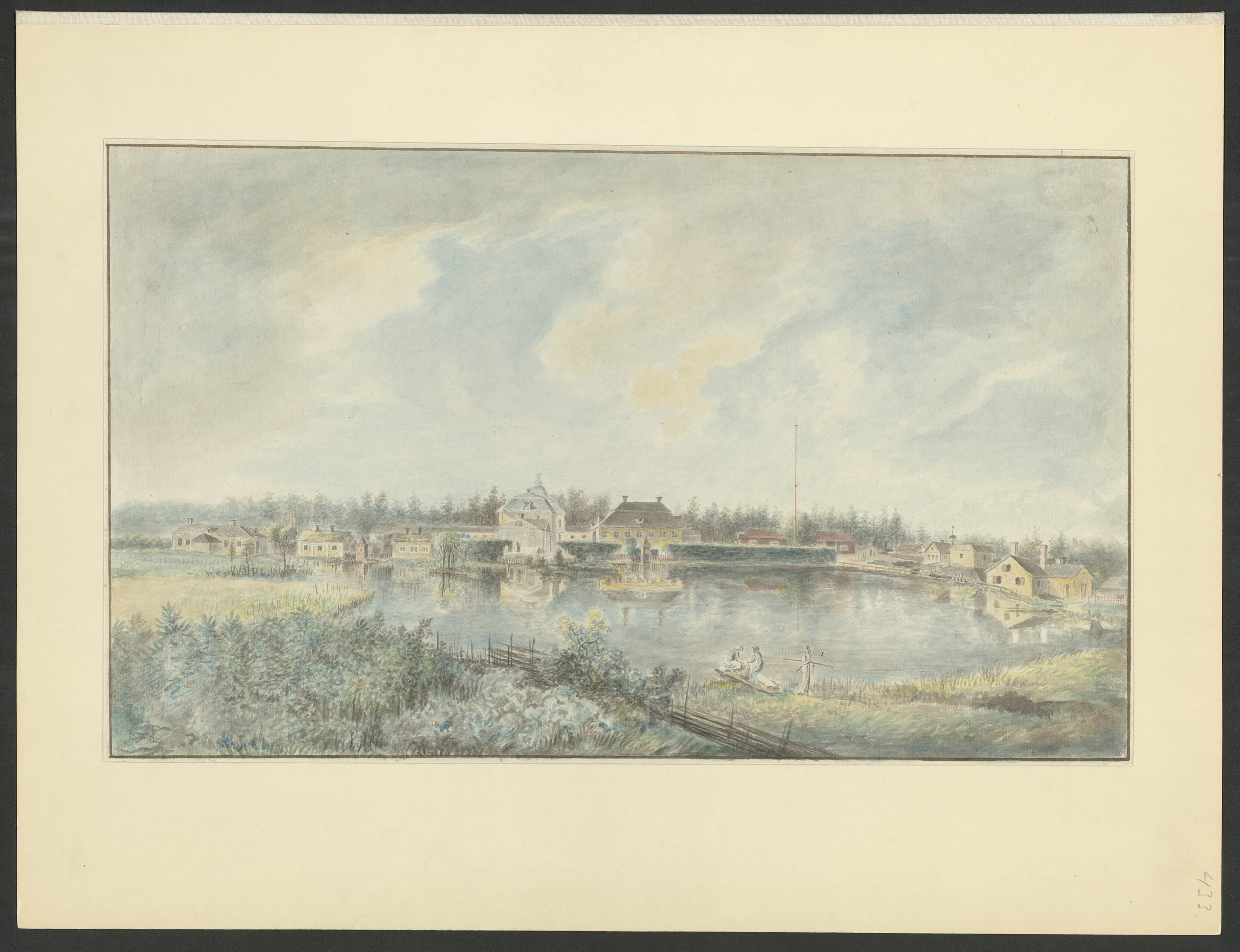 Beskrivning: 1 bl. : Vy över herrgården med bruksdammen i förgrunden.