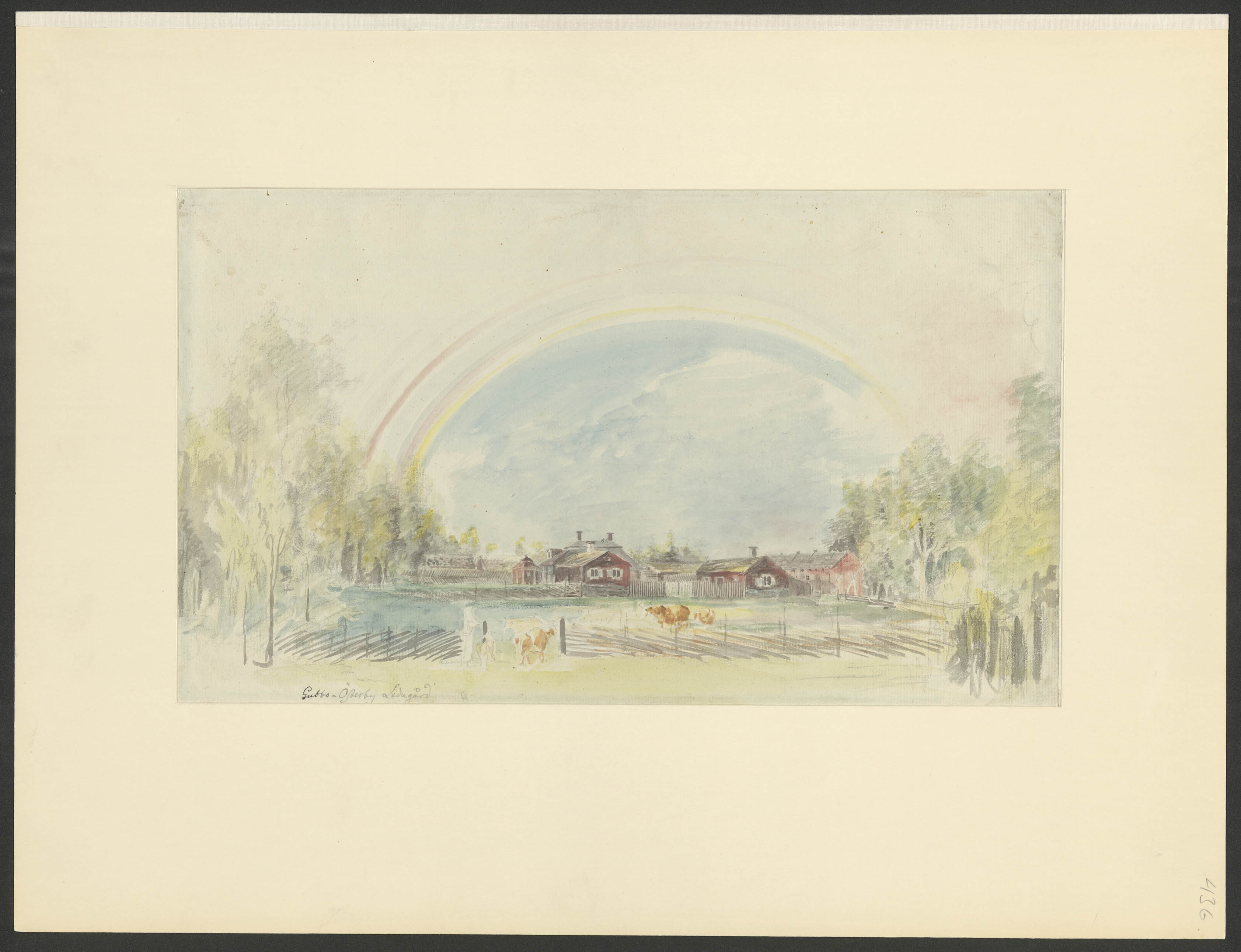 Beskrivning: 1 bl. : Vy över ladugårdsanläggningen med kohagen i förgrunden. På himlen en regnbåge.