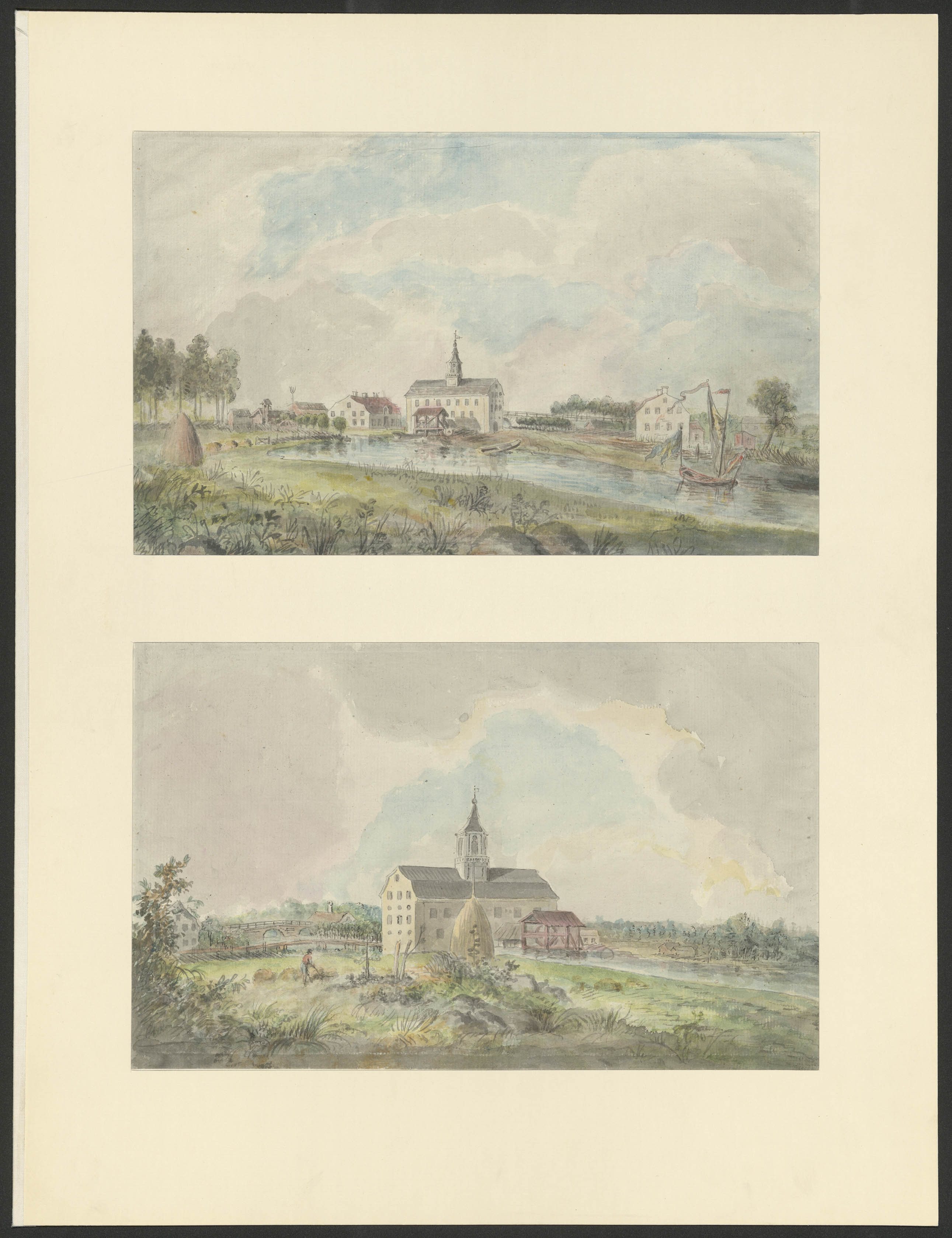 Beskrivning: 1 bl. : Vy med bruksherrgården och dammen i mitten. Herrgården. I förgrunden en man som vålmar hö.