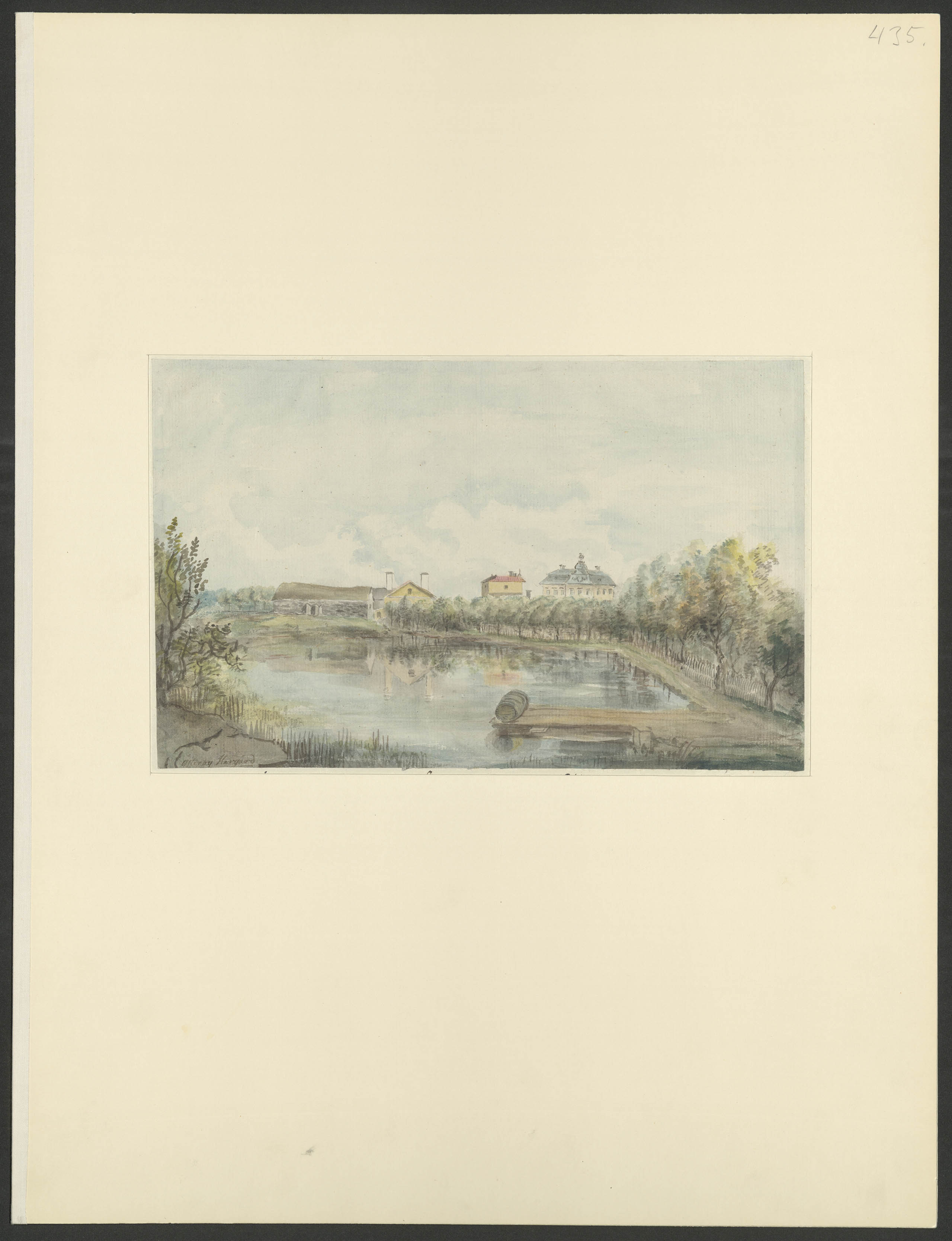 Beskrivning: 1 bl. : Utsikt över bruksdammen mot herrgården och övriga byggnader.