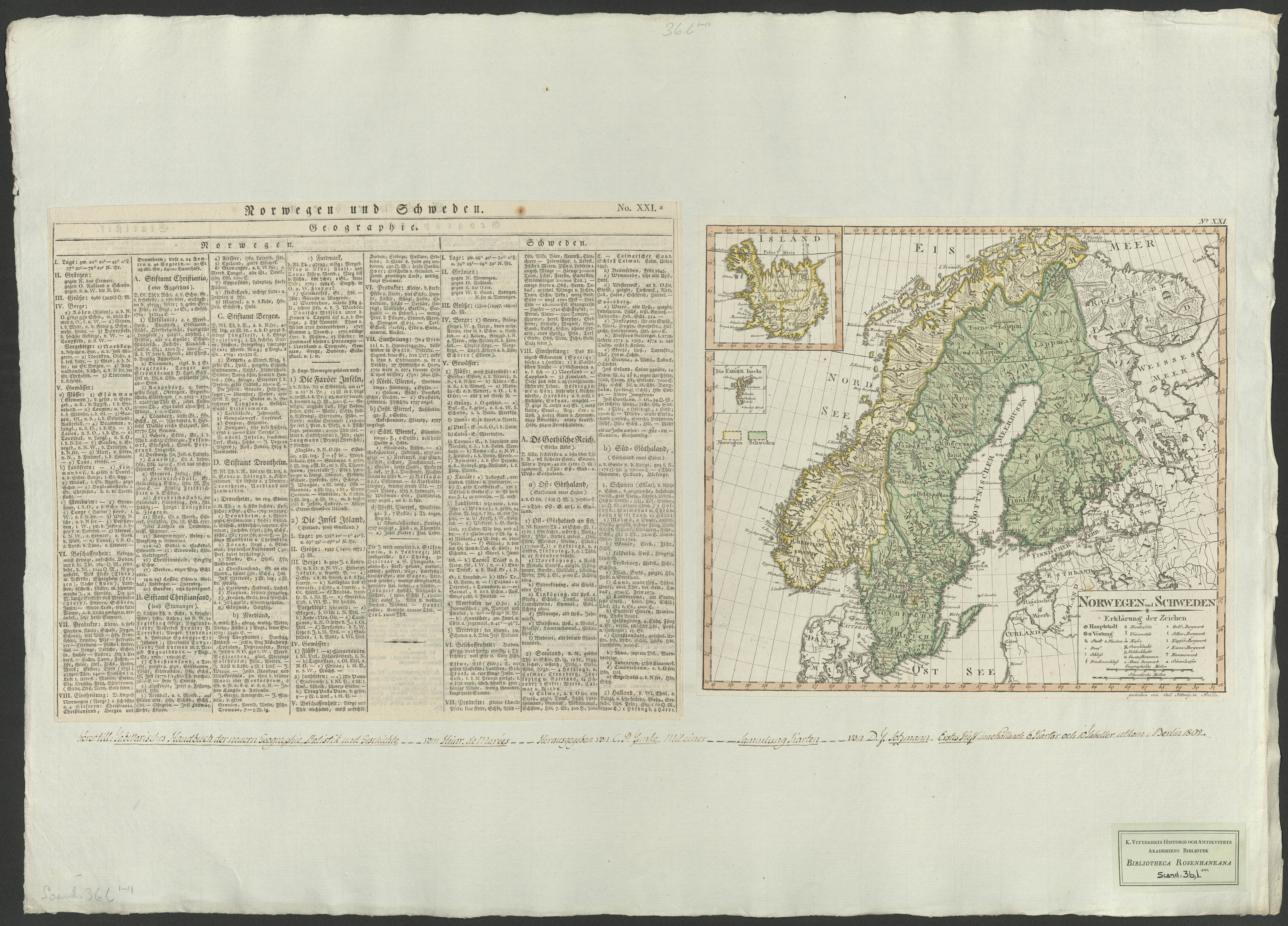 Beskrivning: 1 karta : En vikt textsida med geografiska och statistiska beskrivningar av orter på kartan. En kolorerad karta över Skandinavinen och Finland. Island och Färöarna på infällda specialer.