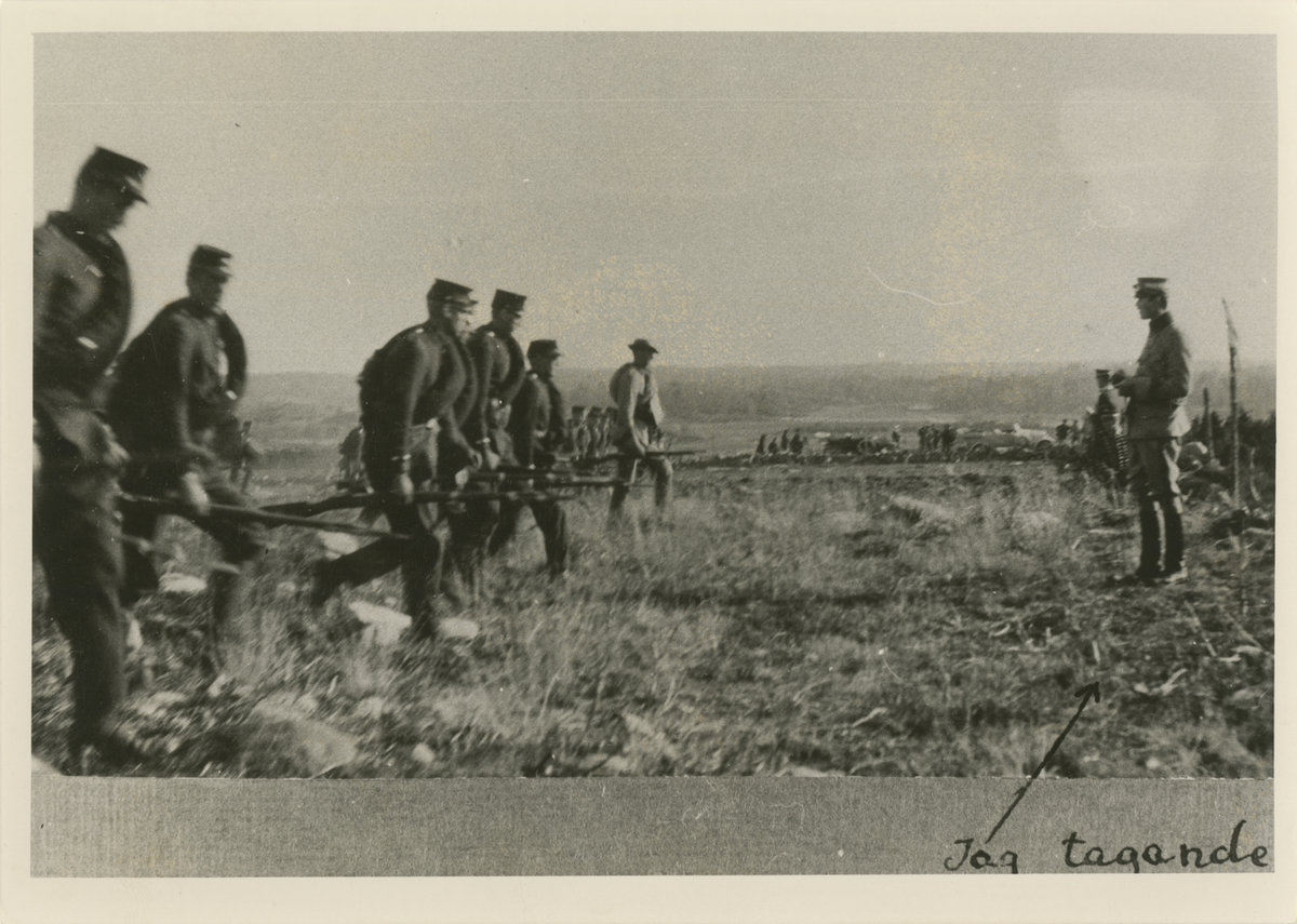 Livregementets husarer K 3 går till fots över ett fält, beväpnade med gevär m/1896.