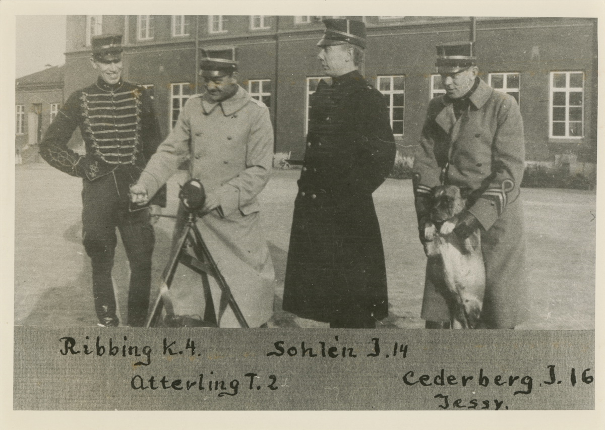 Fyra officerare från olika regementen besöker Livregementets husarer K 3: Ribbing (K 4), Sohlén (I 14), Atterling (T 2), Cederberg (I 16) samt hunden Jessy. År 1914 eller 1915.
