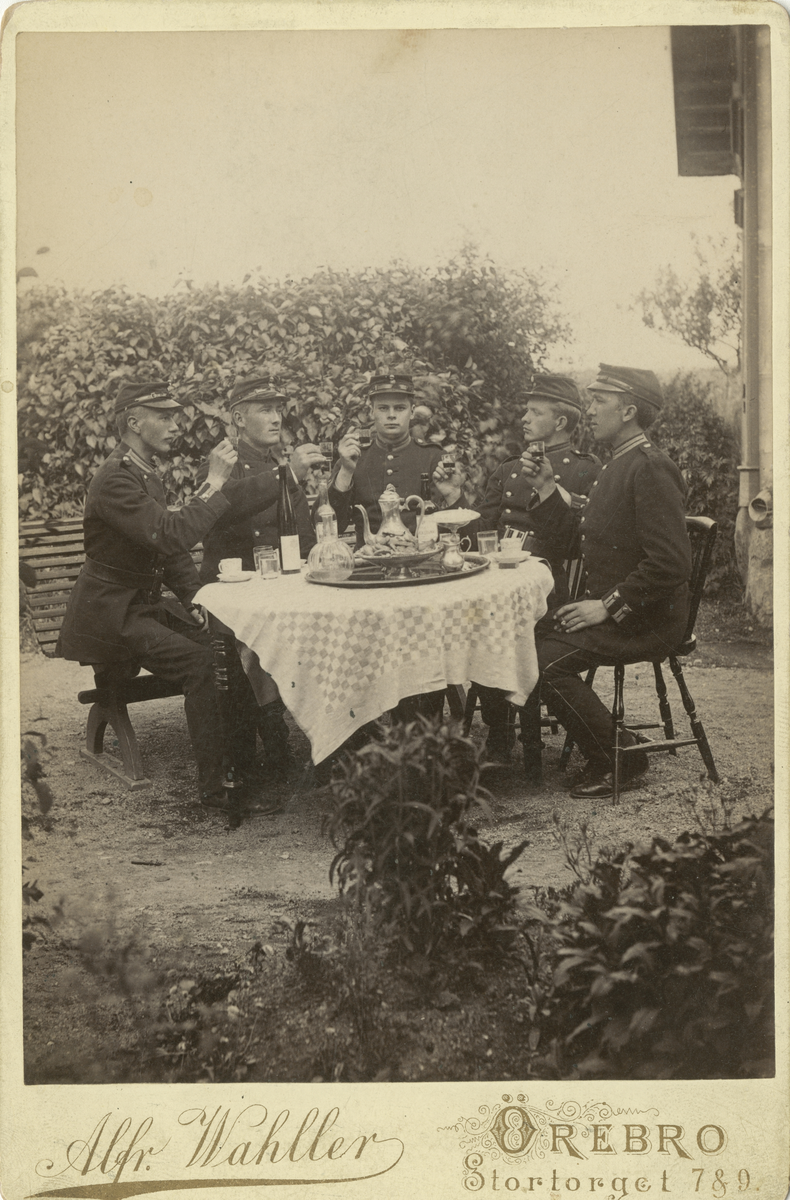 Titel: Kafferep med tillbehör i trädgården med Västmanlands regemente I 18.