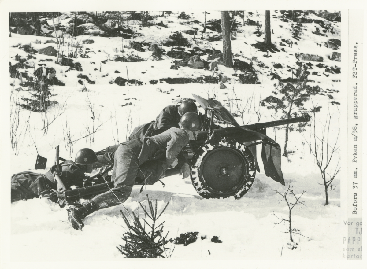 Bofors 37 mm pansarvärnskanon m/1938 i en snötäckt skog.