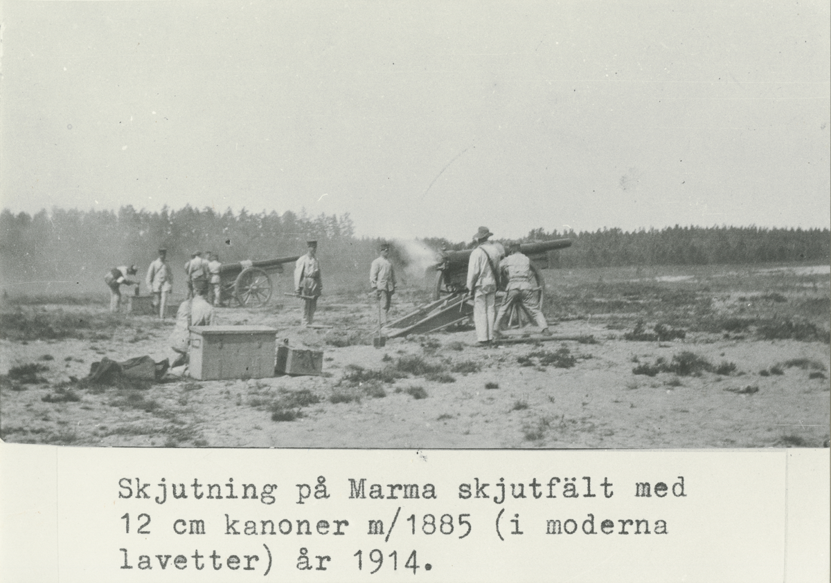 Skjutövning på Marma skjutfält med 12 cm kanon m/1885 monterad på lavetter, 1914.