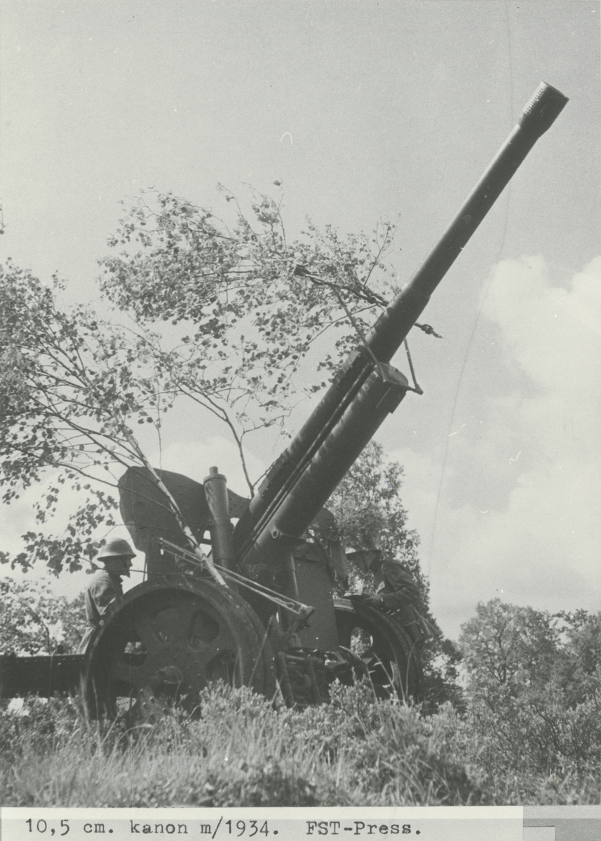 10,5 cm kanon m/1934 riktad mot himlen, kamouflerad med löv.