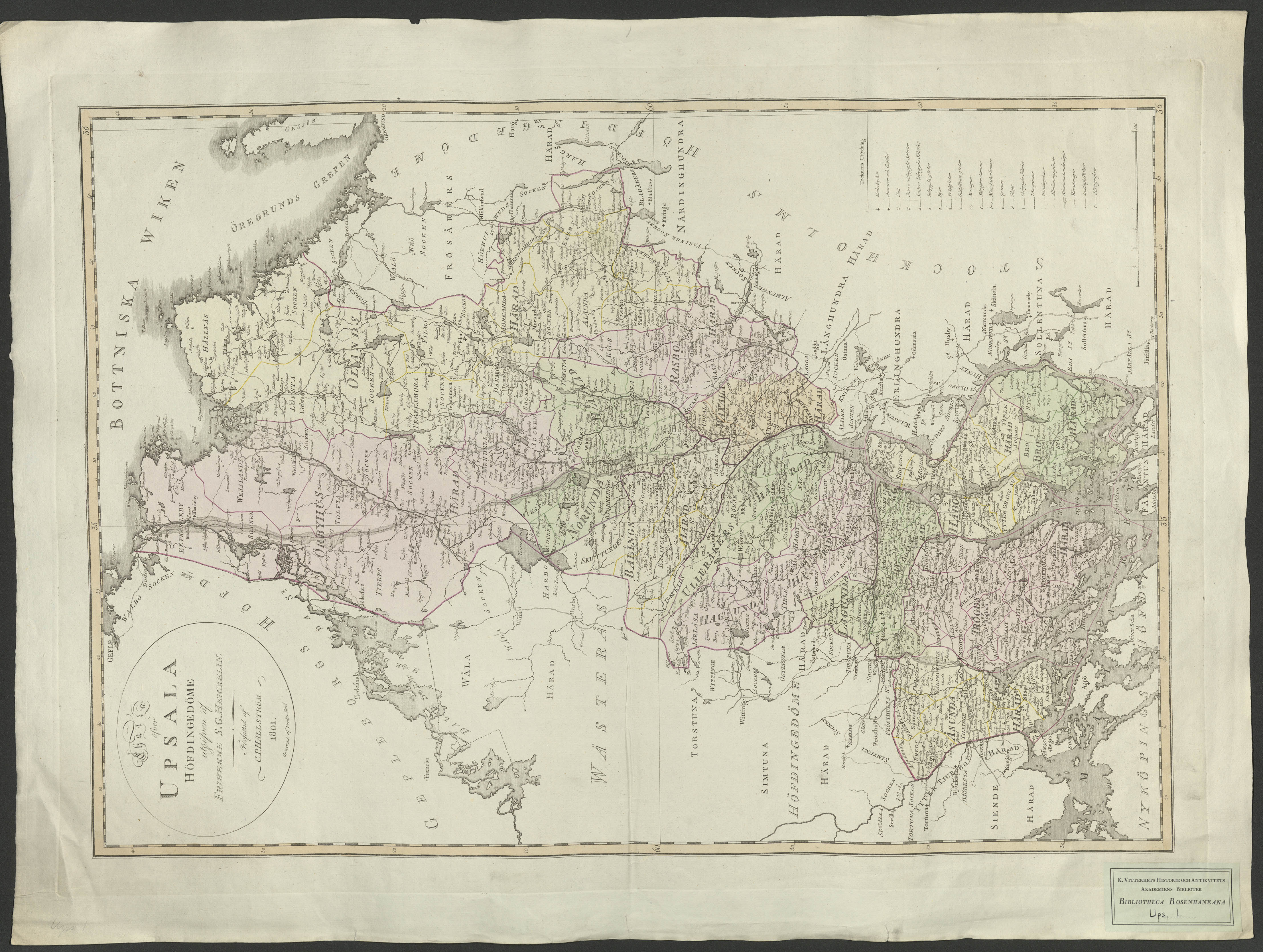 Beskrivning: 1 karta : Visar Uppsala län. Vägar och viktigare bebyggelse. Häraderna kolorerade. Författad af C. P. Hällström. 1801. Graverad af Fredr. Akrel.