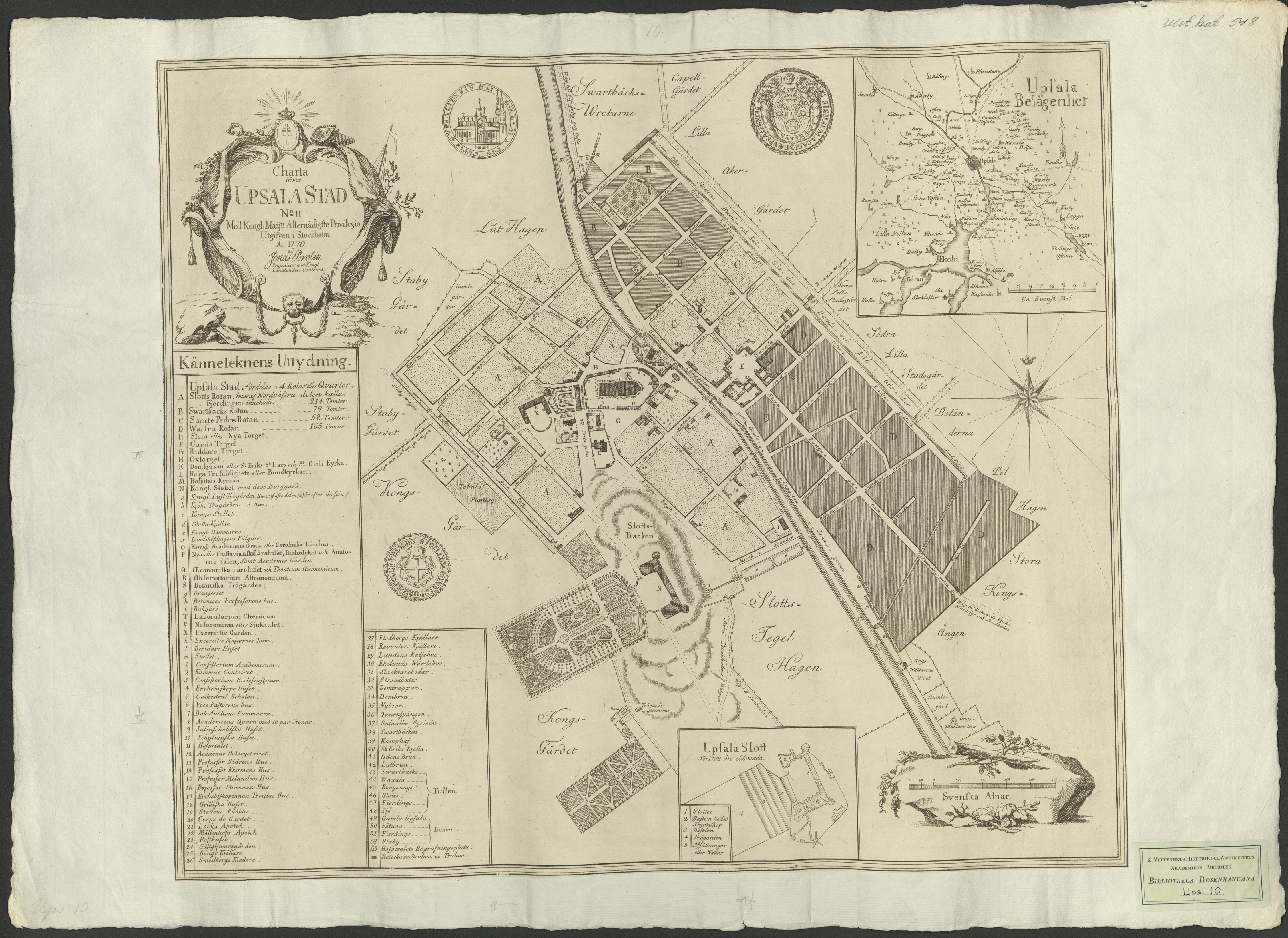 Charta öfwer Upsala Stad No II.Med Kongl. Maijts allernådigaste privilegio utgifven i Stockholm år 1770 af J. Brolin.