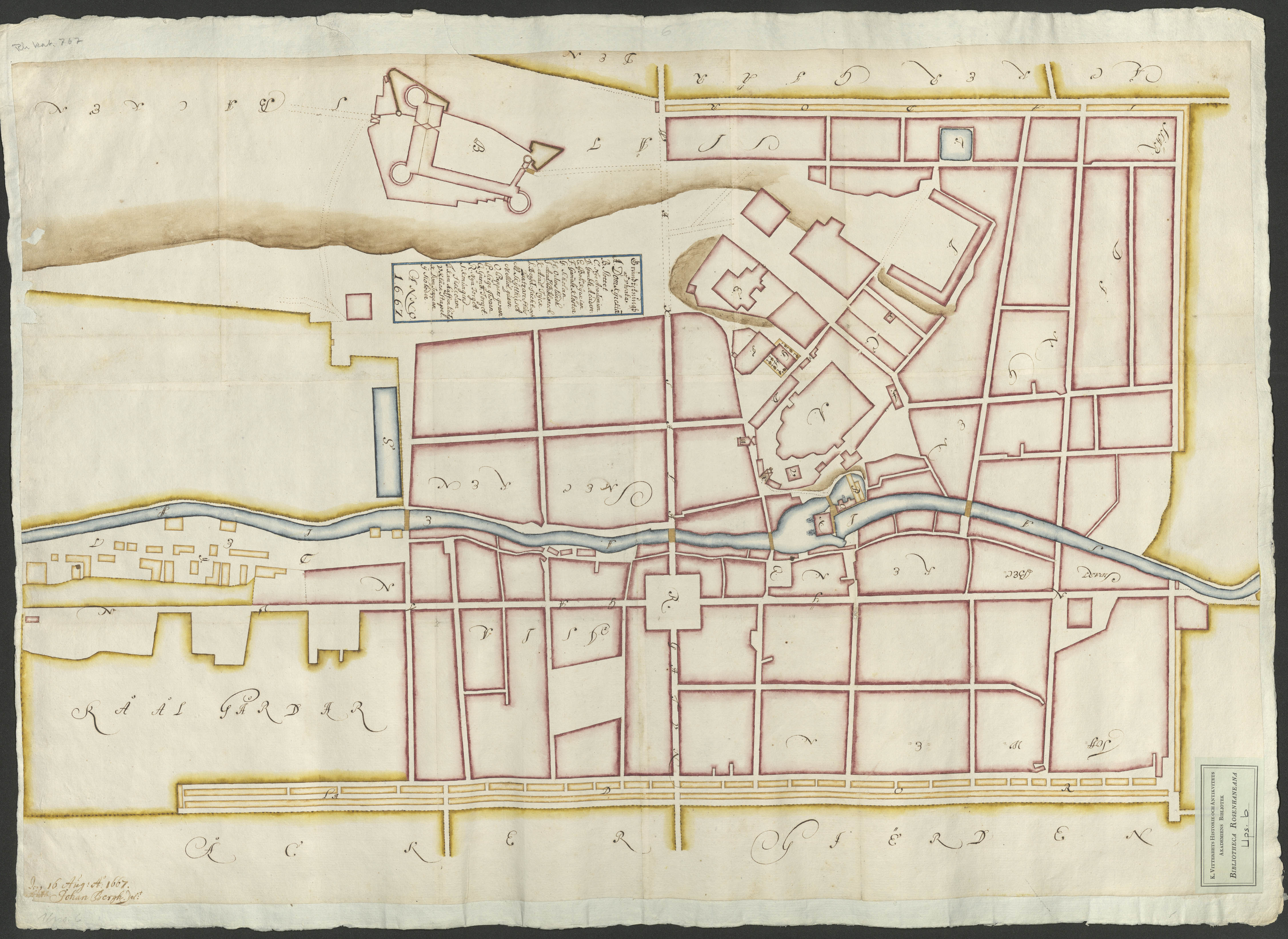 Beskrivning: 1 handritad karta : Stadsplanen. Kvarteren kolorerade. Teckenförklaring. Johan Bergh del.
