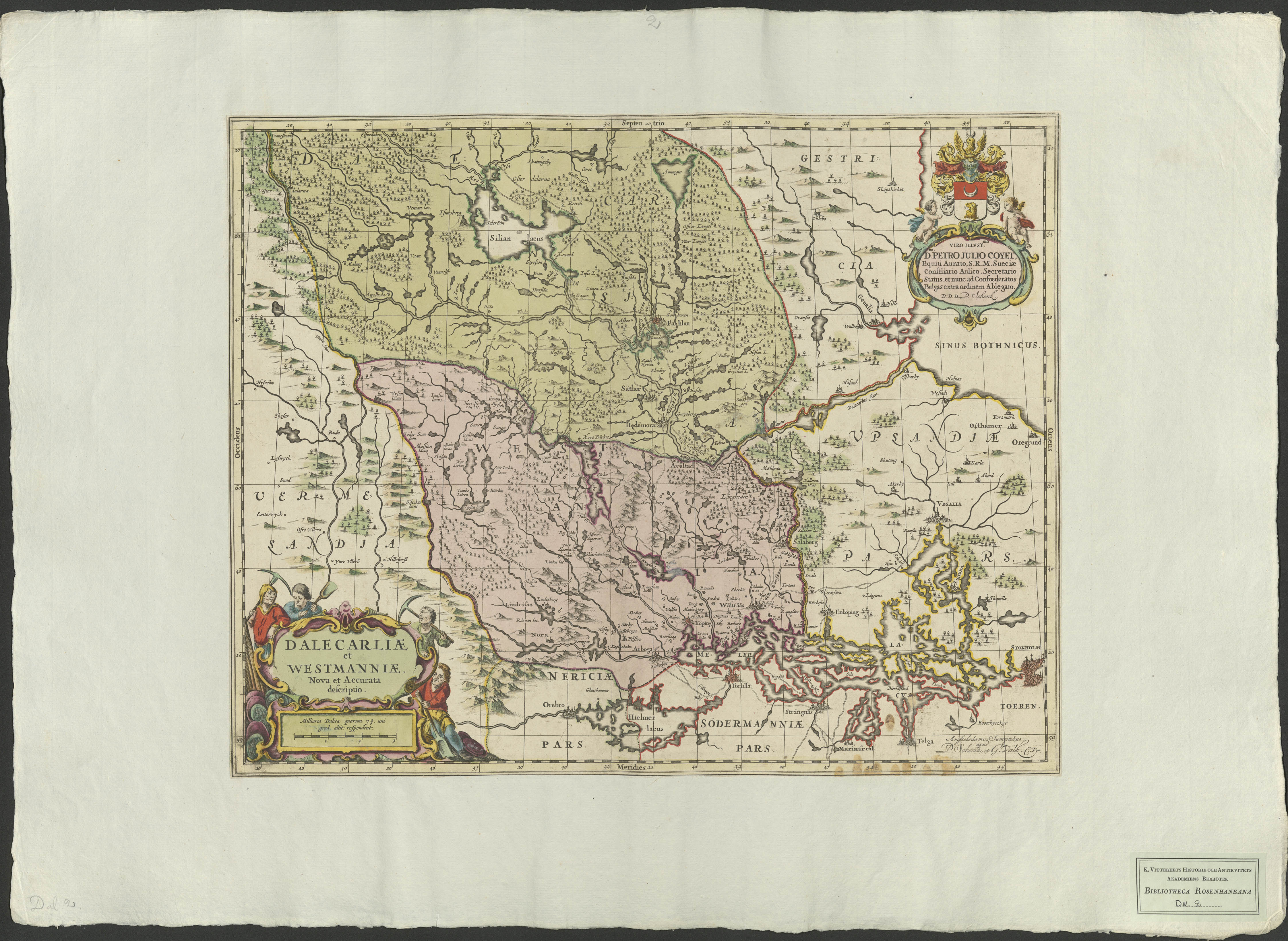 Beskrivning: 1 karta : Topografisk karta över Dalarna och Västmanland. Landskapen samt vissa detaljer kolorerade. Amstelodami ... P. Schenk et G. Valk.