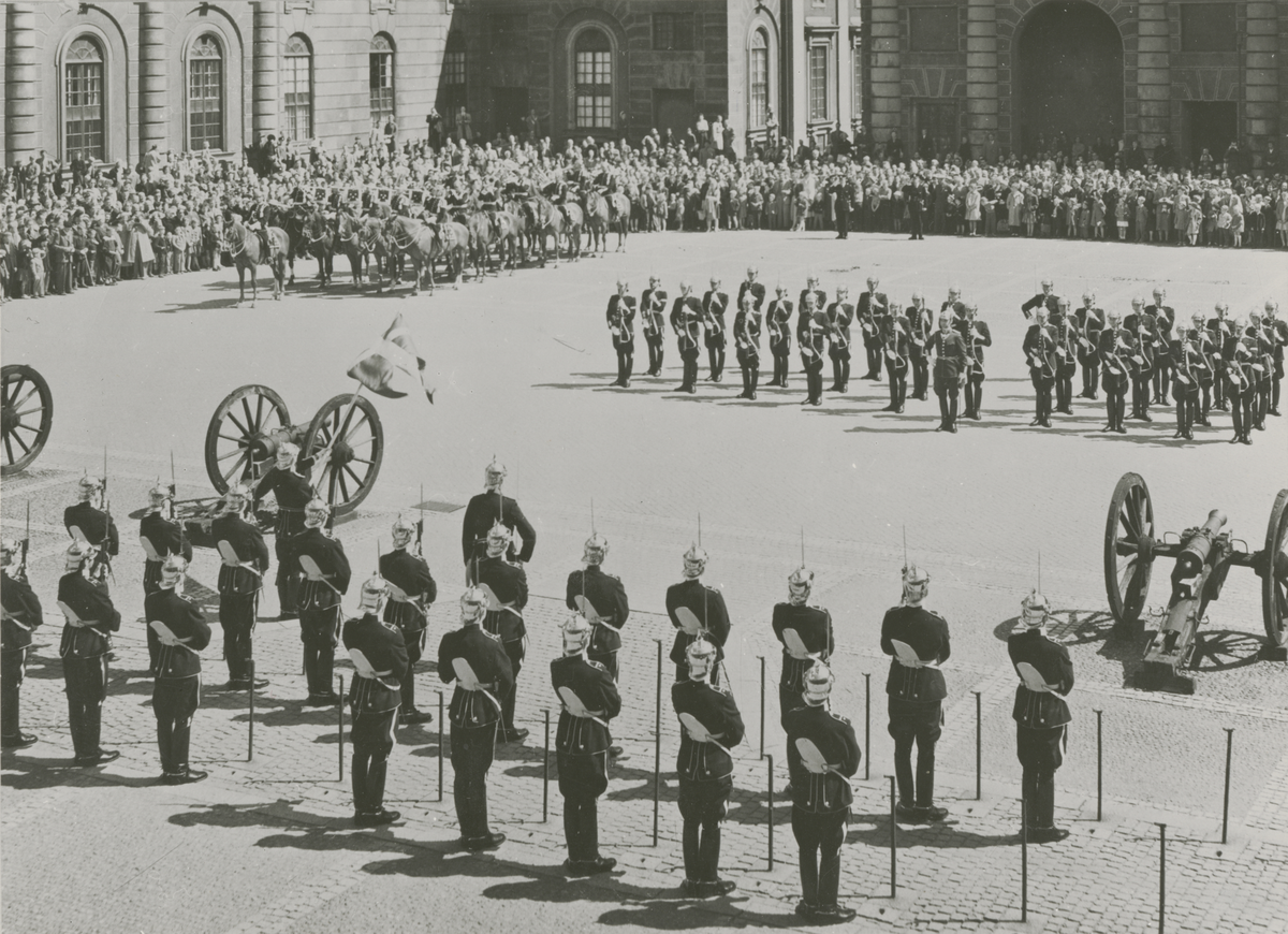 Ridande högvakt på Yttre borggården, klädda i uniform m/ä.