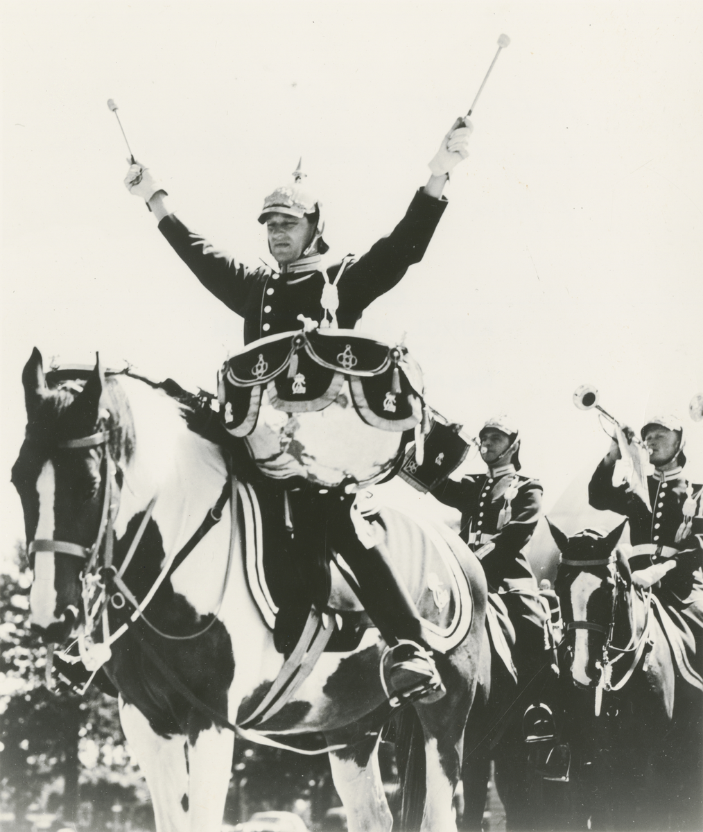 Pukslagare till häst i uniform m/ä, med två musiker i bakgrunden som spelar basuner.