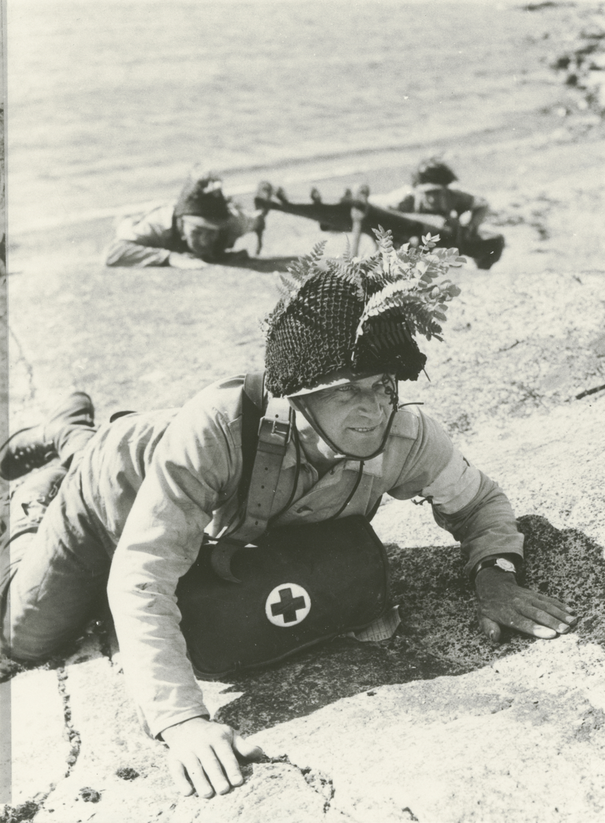 TMilitär sjukvård på en klippig strand. Tre män tar sig upp, och den främste bär en väska märkt med Röda Korset.