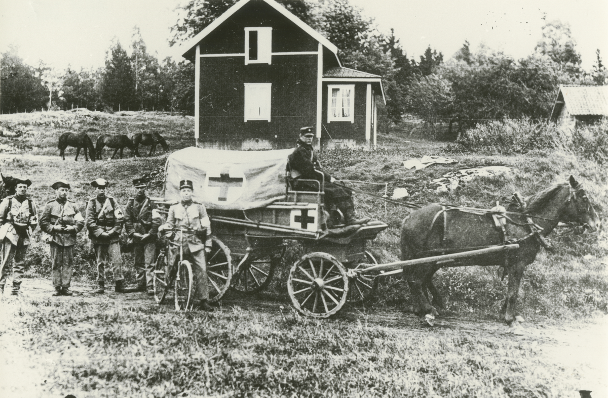 Hästambulans utanför ett hus, med soldater i uniform m/1886 och m/1910..