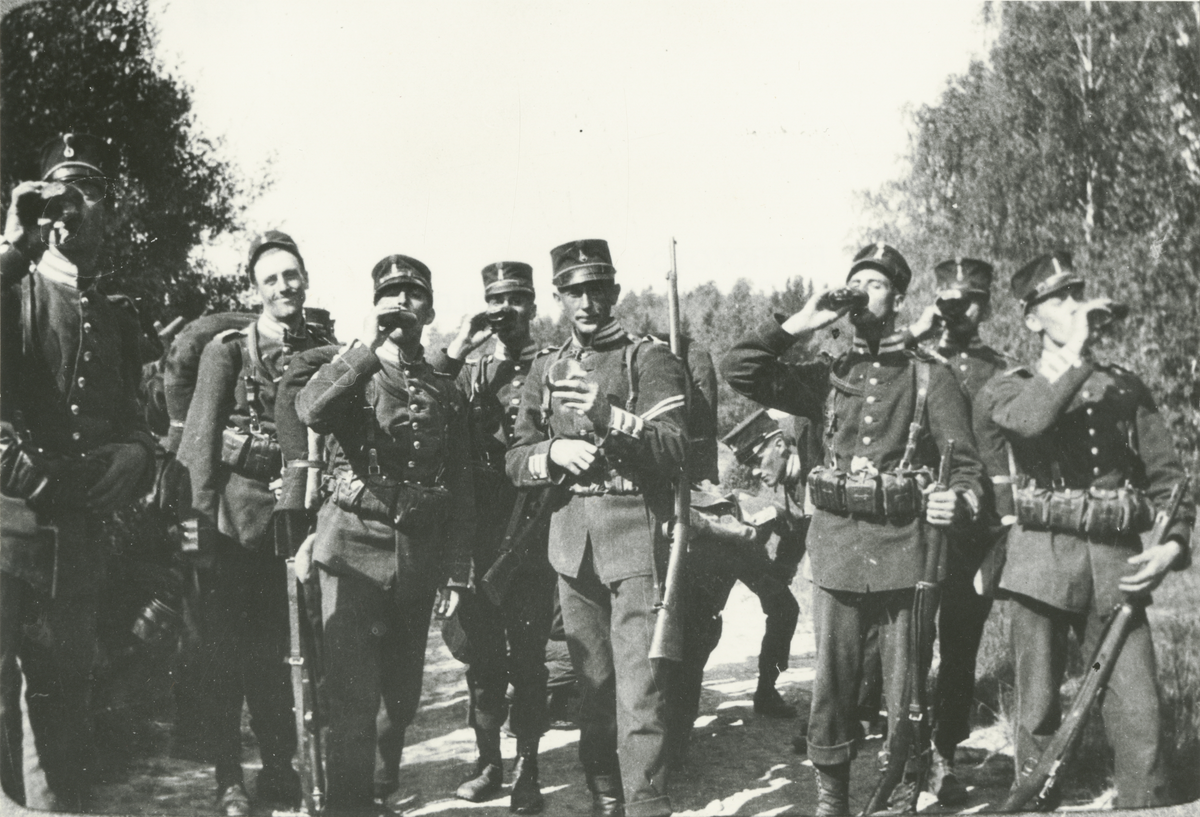 Titel: Män på marsch tar en paus mitt på landsvägen och dricker ur pluntor.