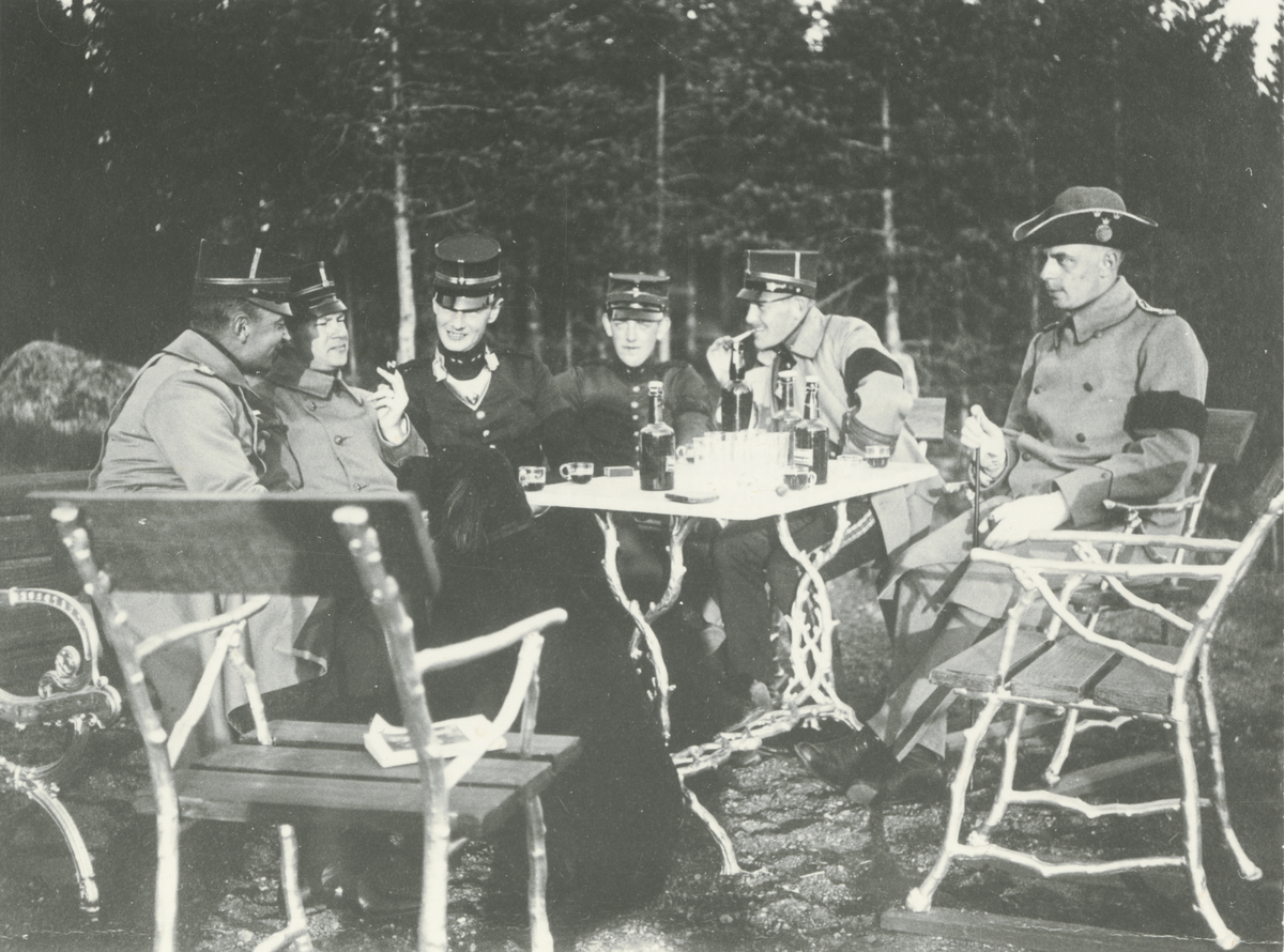 Officerare samlade kring ett bord med drycker i skogen. Två av dem bär sorgband, och en har en vaktbricka.