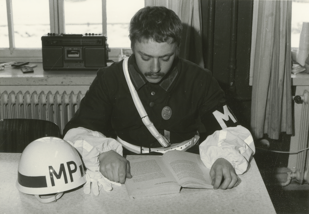 Titel: Militärpolis i uniform studerar vid ett bord på logementet.