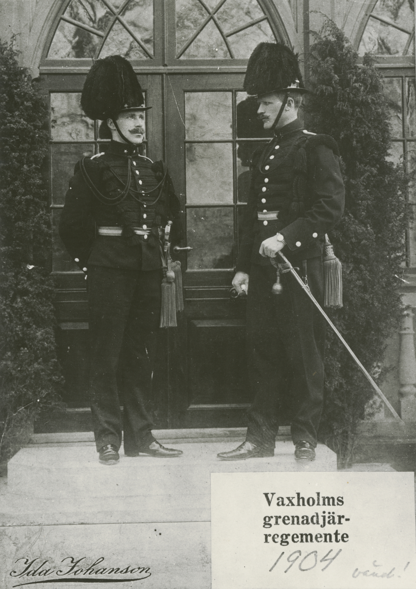 Två män från Värmlands fältjägarregemente, senare Vaxholms grenadjärregemente, poserar framför en byggnad.