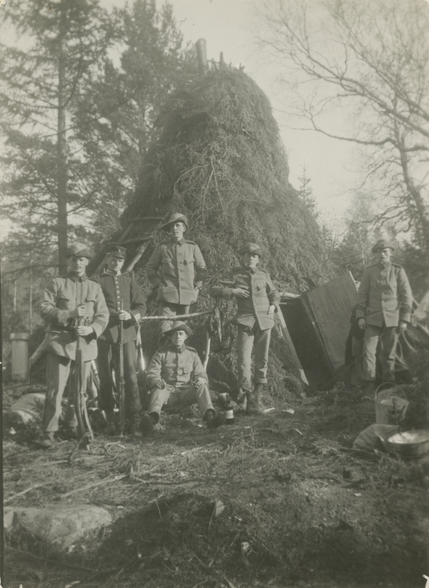 Titel: Soldater samlade vid en lägerhydda under 1910-talet.