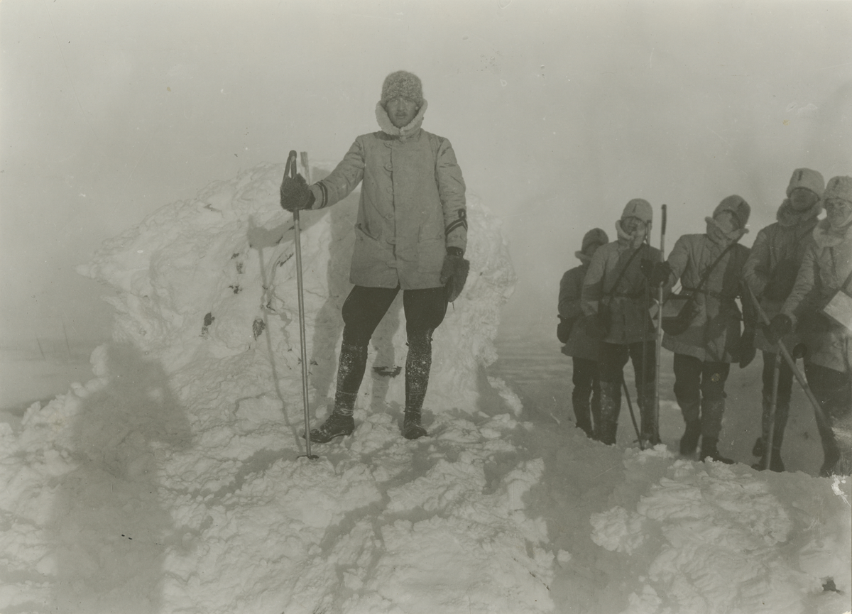 Man i vinterkappa poserar vid ett snöblock, hållande en skidstav.