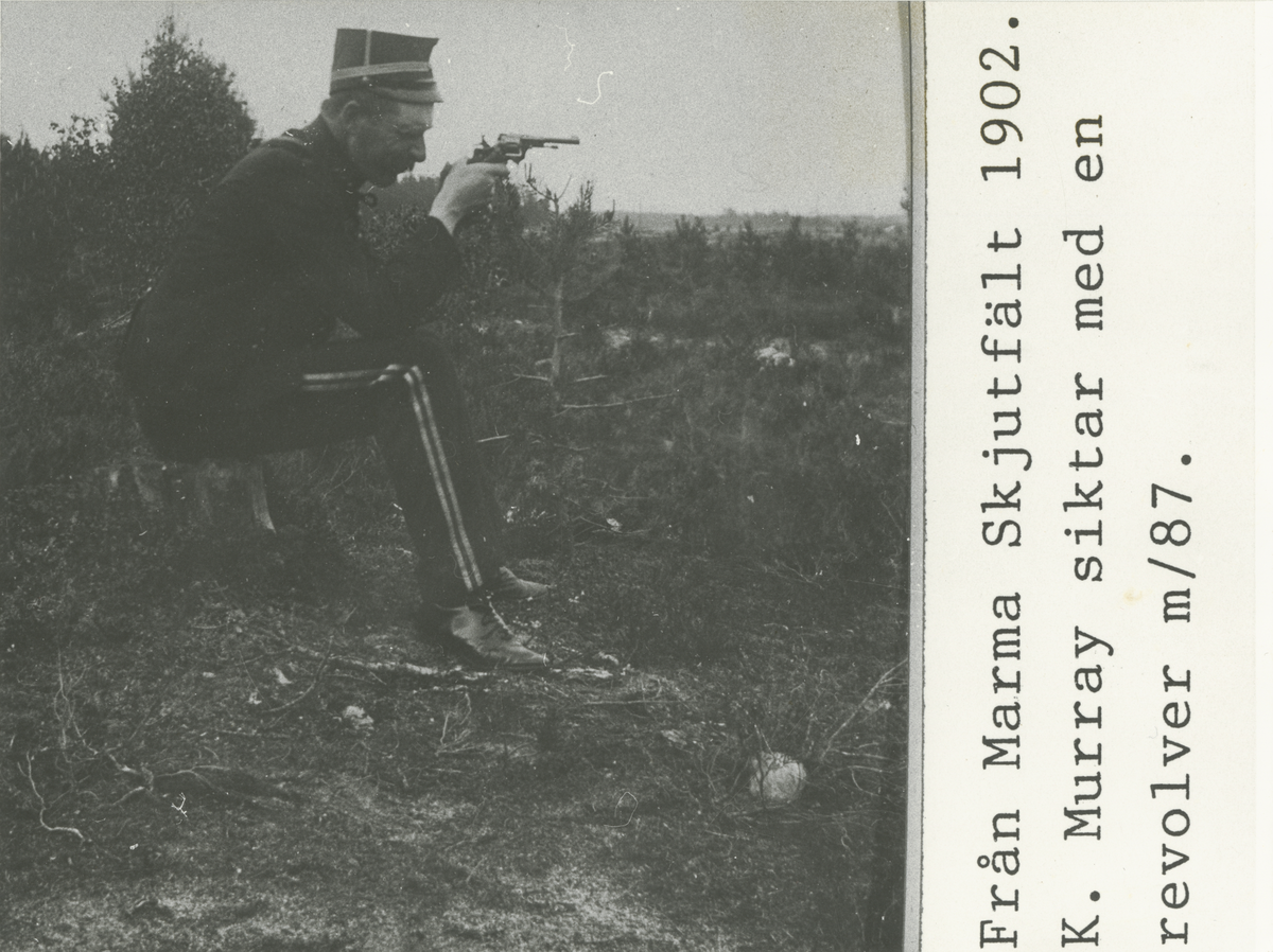 K. Murray på Marma skjutfält och siktar med en revolver m/1887.