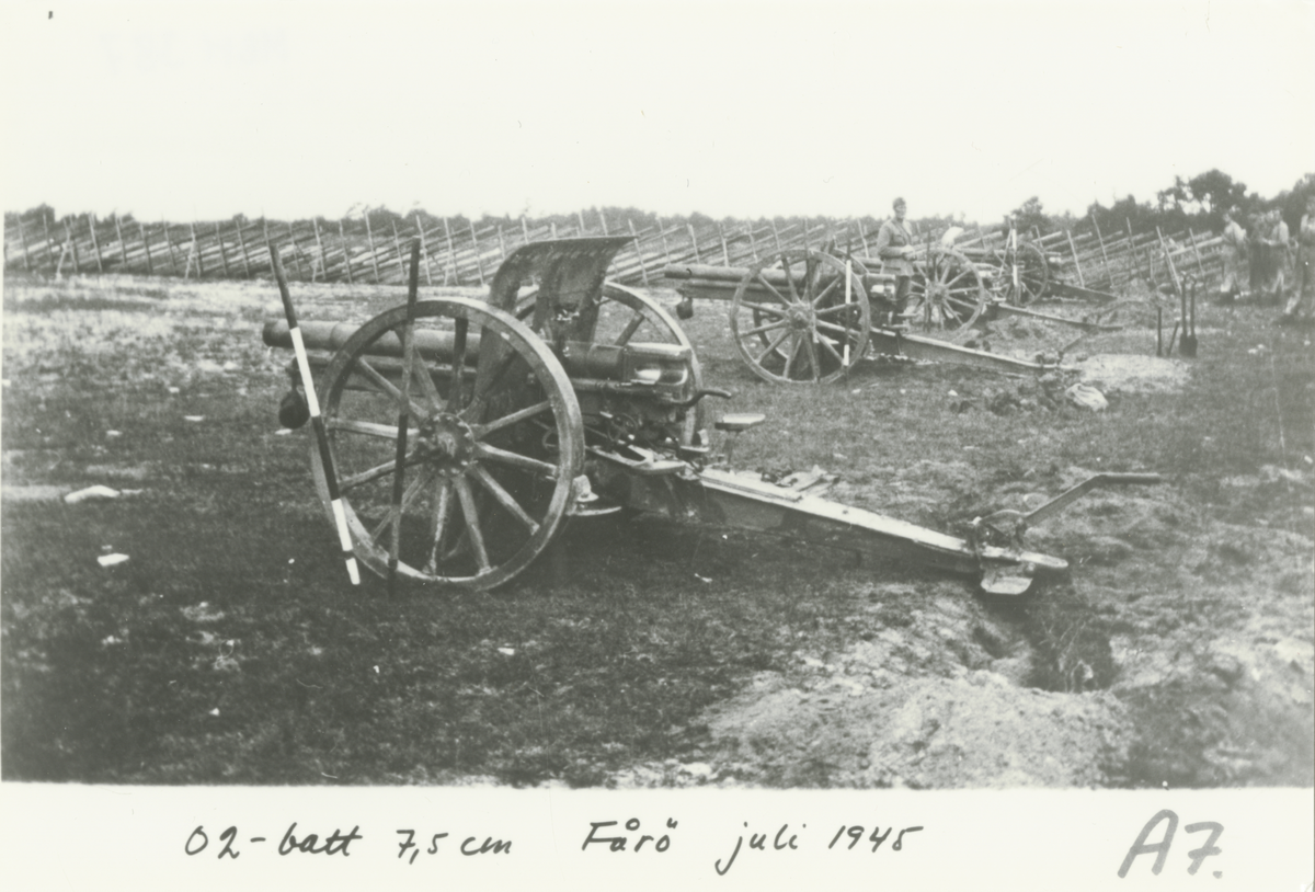 Fyra 7,5 cm kanoner m/1902 från A 7 uppställda på fält, med servisen i bakgrunden, Fårö, 1945.