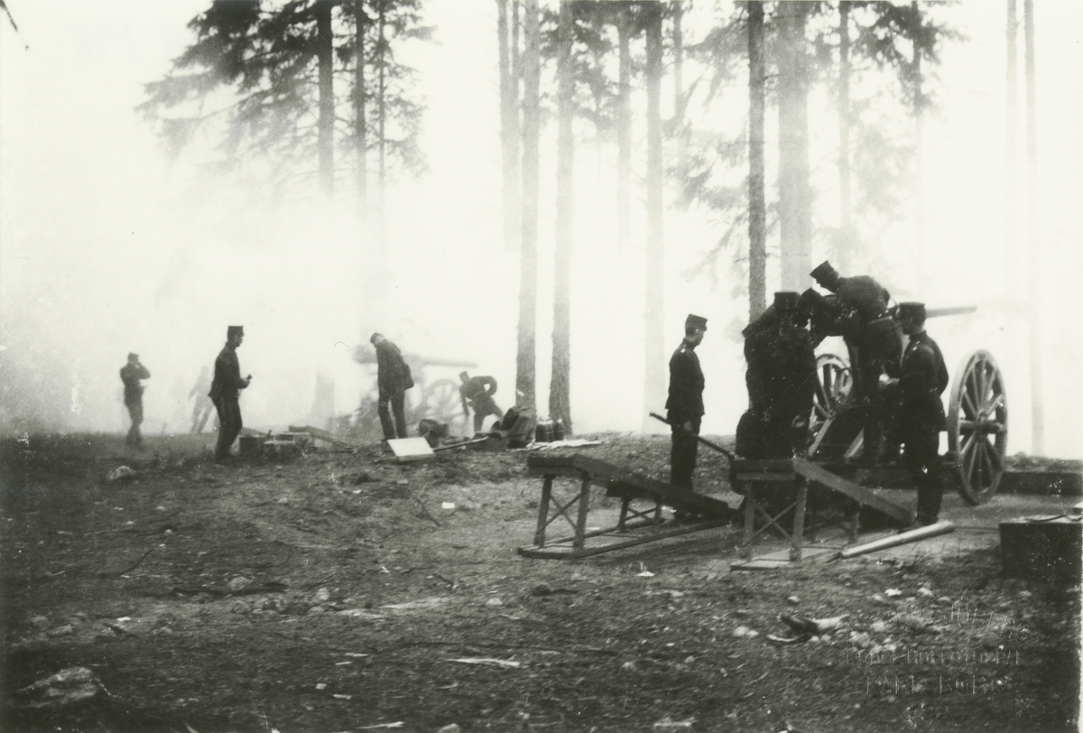 Titel: Två 12 cm kanoner m/1885 från positionsartilleriet uppställda i en skog under eldgivning.