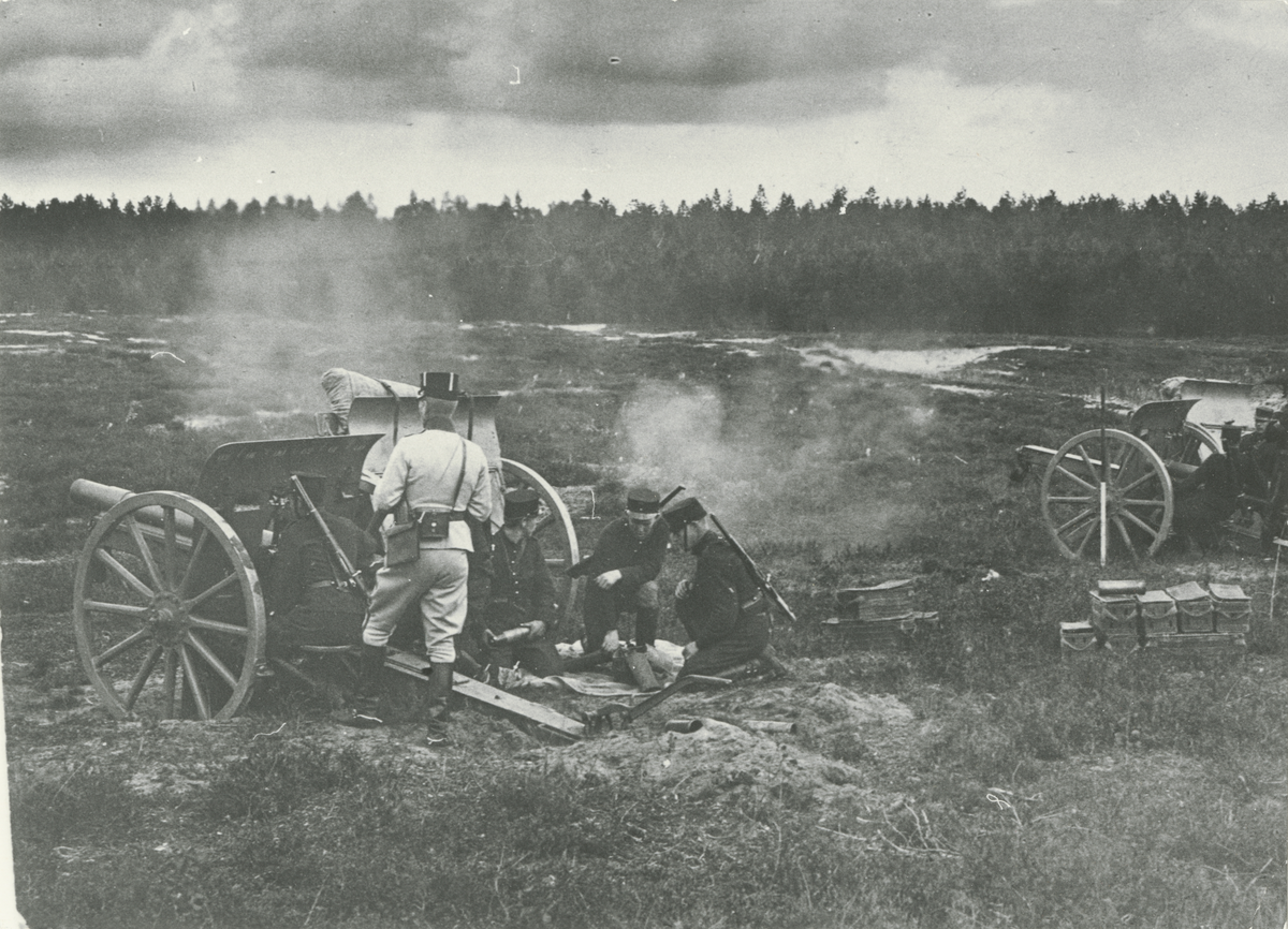 Två 7,5 cm kanoner m/1902 under skjutövning på fältet. Servisen är utrustad med karbiner m/1894-1914.