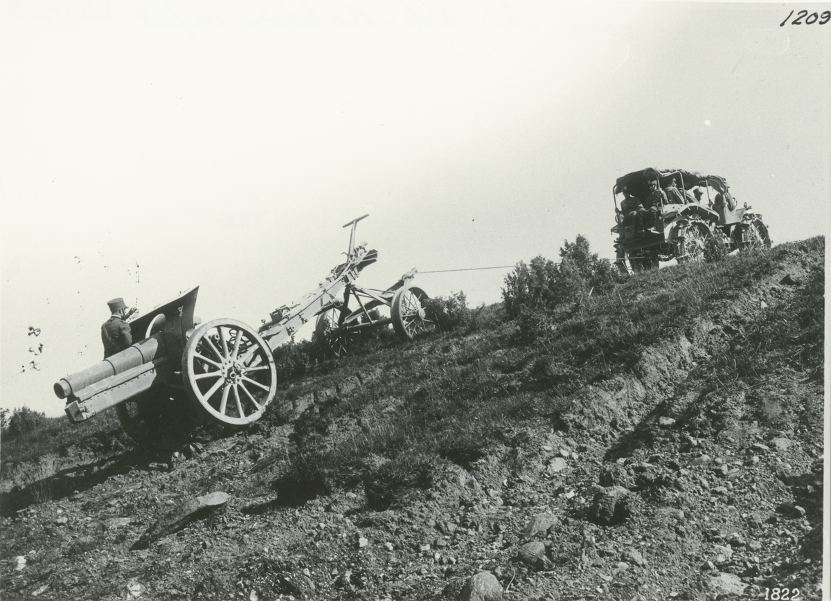 En italiensk artilleritraktor av samma typ som den svenska artilleritraktorn m/1928 drar en haubits uppför en sluttning..