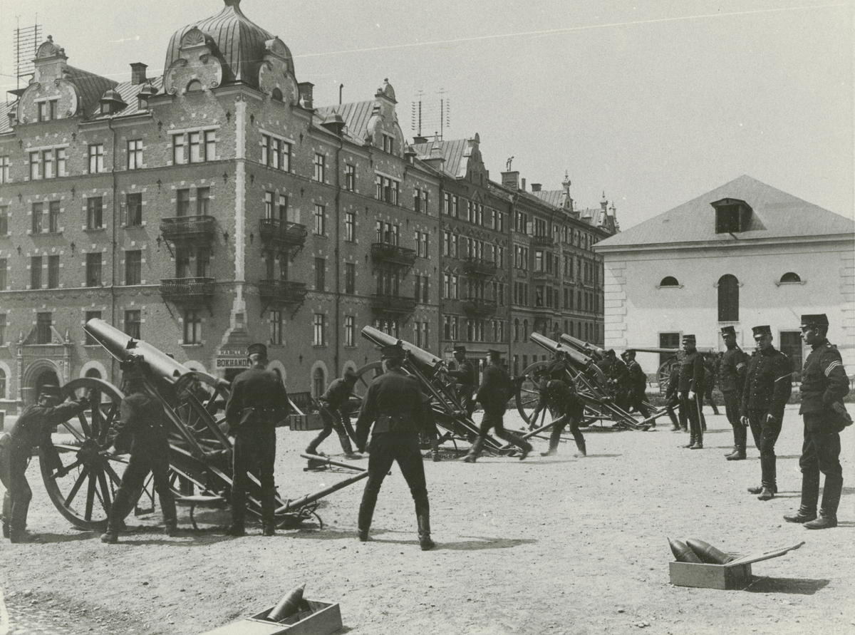 Titel: Fyra 12 cm haubitser m/1891 ur positionsartilleriet uppställda vid kasernerna på Storgatan i Stockholm.