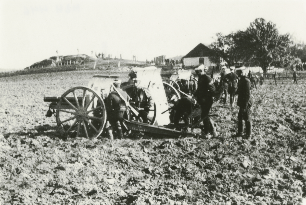En rad med 7,5 cm kanoner m/1902-1910 uppställda på en åker.