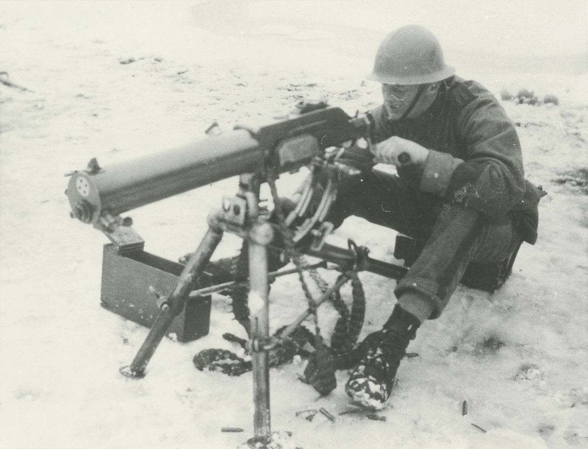 Titel: En man sitter på en låda bakom en kulspruta ksp m/1914 Schwarzlose.